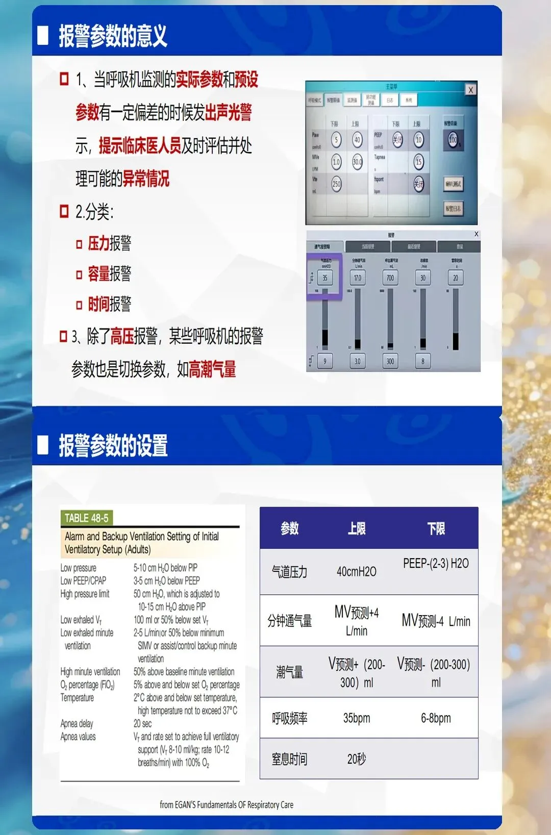 - BIPAP(双水平气道正压):两个压力水平交替,适用于ARDS