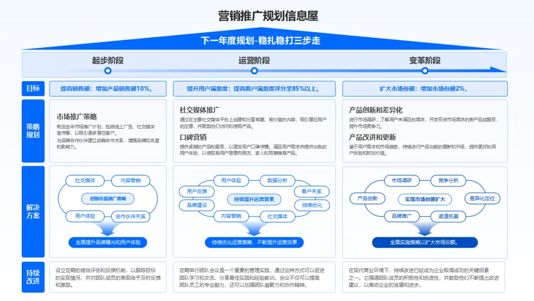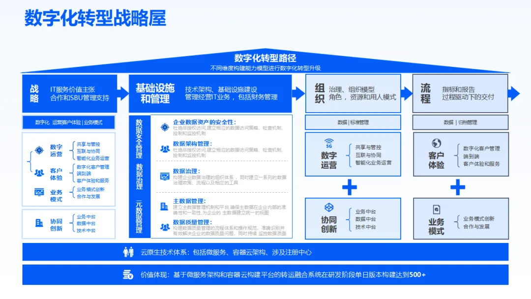 本方案提供了一套系统性的数字化转型通用框架,旨在帮助企业从战略、组织、流程、技术、数据与人才等多个维度构建转型能力。方案强调,数字化转型不仅是技术升级,更是业务模式、运营体系与组织文化的系统性重构,需以“战略屋”为顶层指引,明确愿景、支柱与基石,并通过“稳扎稳打三步走”(起步、运营、变革)实现渐进式演进。方案核心架构围绕“双中台”(业务中台与数据中台)展开,构建敏捷、共享、智能的数字底座,支撑前端多触点、多场景的客户体验与业务创新。同时,方案系统阐述了品牌战略、私域流量运营、全域经营、智能化供应链、敏捷开发平台、数据治理及人才生态供应链等关键支撑模块,形成从战略规划到执行落地的完整闭环。此外,方案以华为、强生、雪佛兰等为案例,展示了品牌升级、达人营销、并购整合等实践路径。整体而言,该模板为不同行业企业提供了可复用的转型方法论与工具集,助力企业在数字化时代构建持续竞争力,实现降本增效与价值创新。