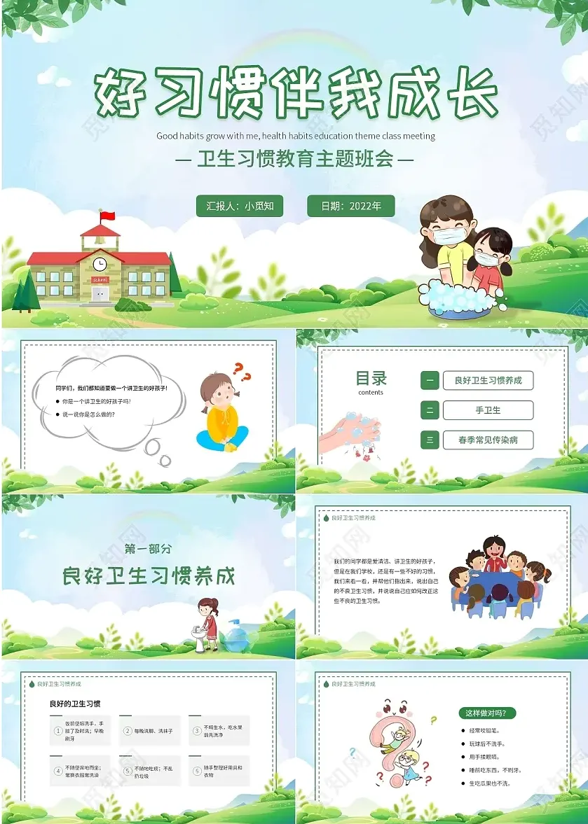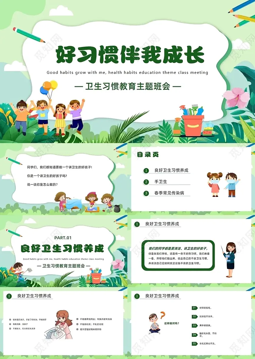 绿色卡通清新可爱好习惯伴我成长卫生习惯教育主题班会PPT