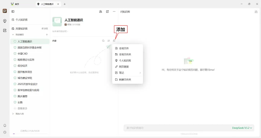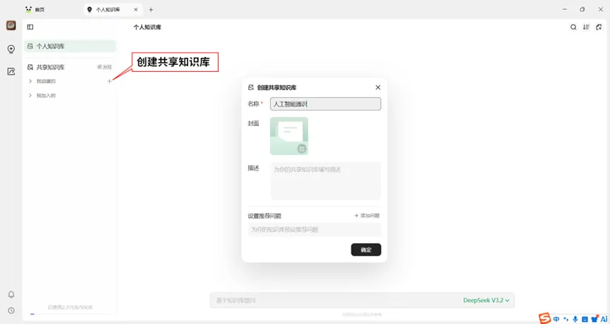 点击如图1所示的界面中的“知识库”,进入如图2所示的知识库管理界面。点击“创建共享知识库”,系统跳出创建窗口,输入“人工智能通识”,点击确认。这样就完成了个人的“人工智能通识”知识库搭建。我们就可以在里面添加自己的知识素材,让AI帮我们进行分析和处理。