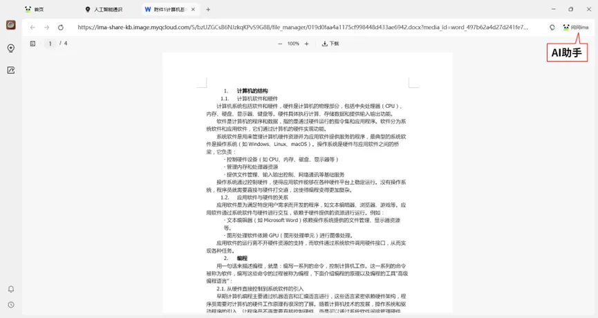 添加完成后,点击上传的文档进入如图4的界面,点击“AI助手”,就可以用AI对上传的知识素材进行分析。