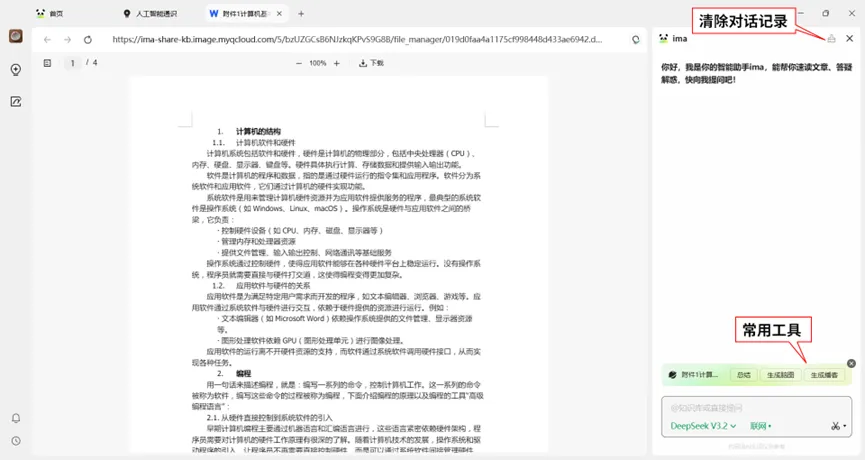 可以在如图5所示的界面与AI进行对话,AI生成的播客和思维导图也可以上传到ima进行再次分析。注意:常用工具栏会在对话后消失,点击“清除对话记录”后这些常用工具将会恢复。