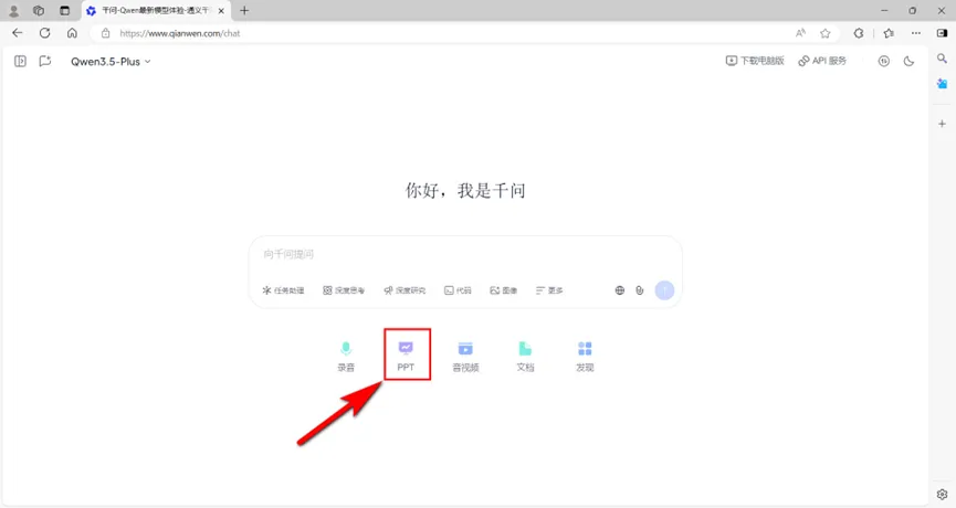 用浏览器输入网址:https://www.qianwen.com/chat进入如图7所示的千问对话界面,点击“PPT”工具进入PPT生成界面。