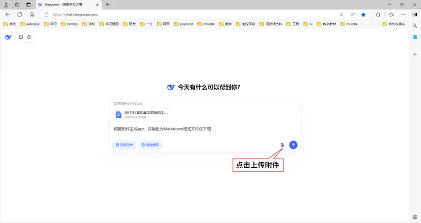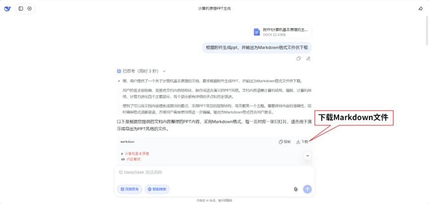 如图9所示,用浏览器输入网址: https://chat.deepseek.com/,把“计算机基本原理”上传作为提示内容,输入提示词“根据附件生成ppt,并输出为Markdown格式文件供下载”。