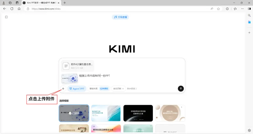 如图11所示,用浏览器输入网址:https://www.kimi.com/slides,上传生成的Markdown文件,输入提示词后,根据提示,选择模板,智能生成ppt文件下载到本地。