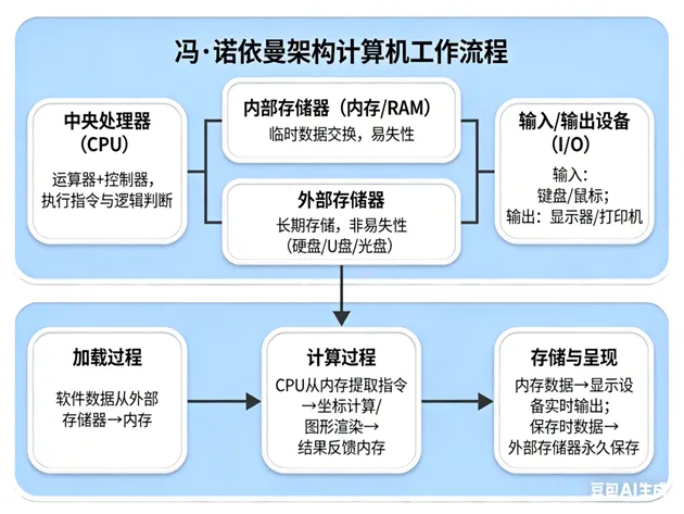 现今主流的计算机、智能手机及各类智能终端,在体系结构上均遵循“冯·诺依曼架构”。冯·诺依曼机由五大基本部分组成,在现代应用中通常归纳为以下四大核心模块: