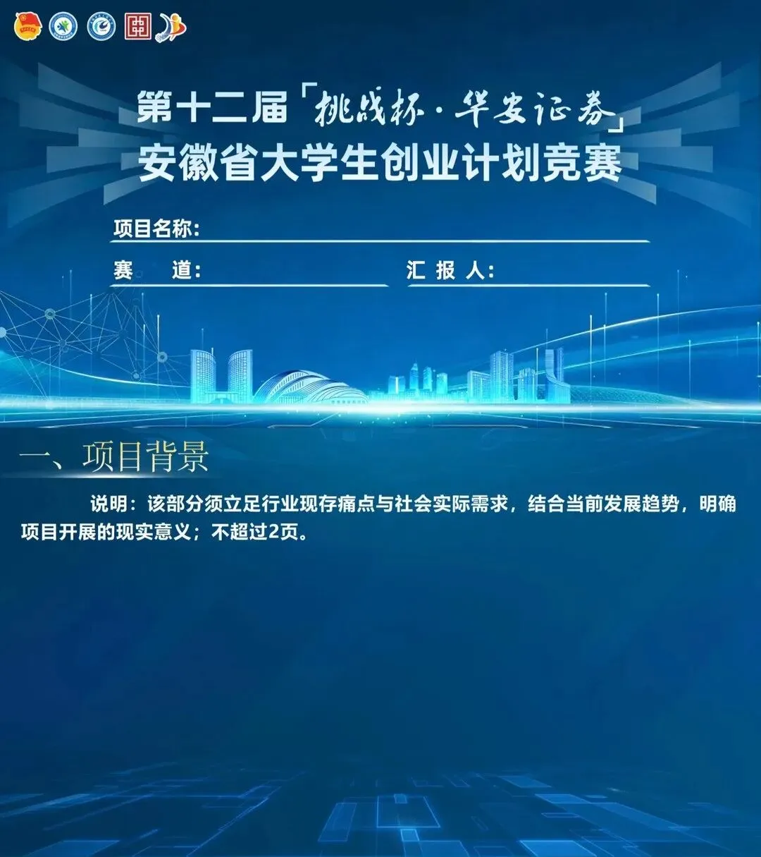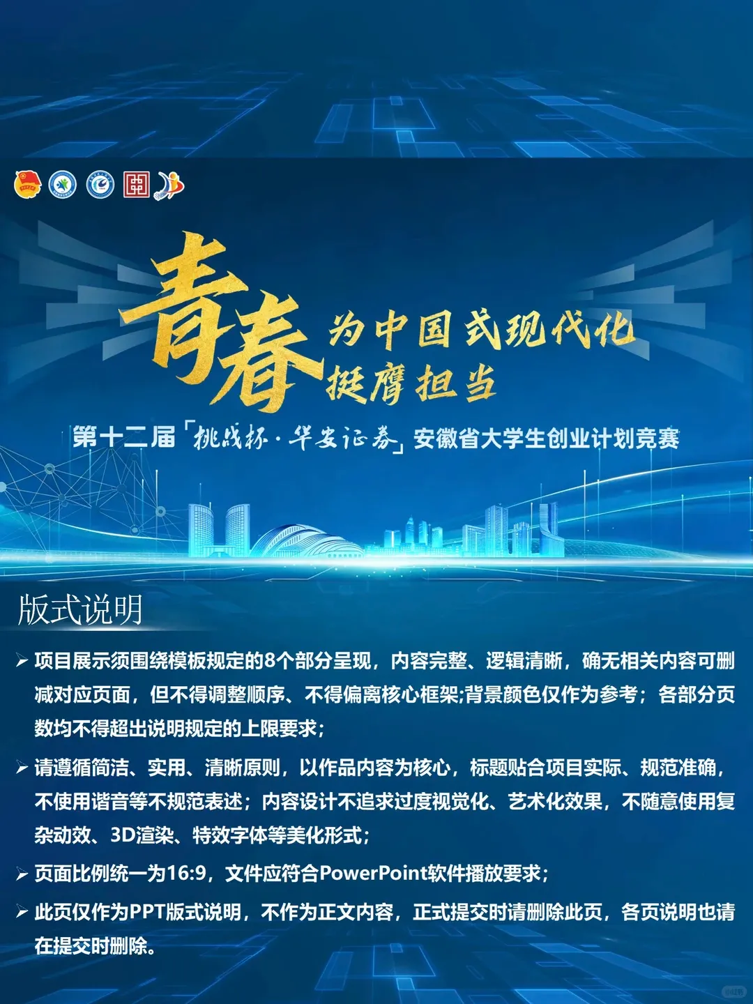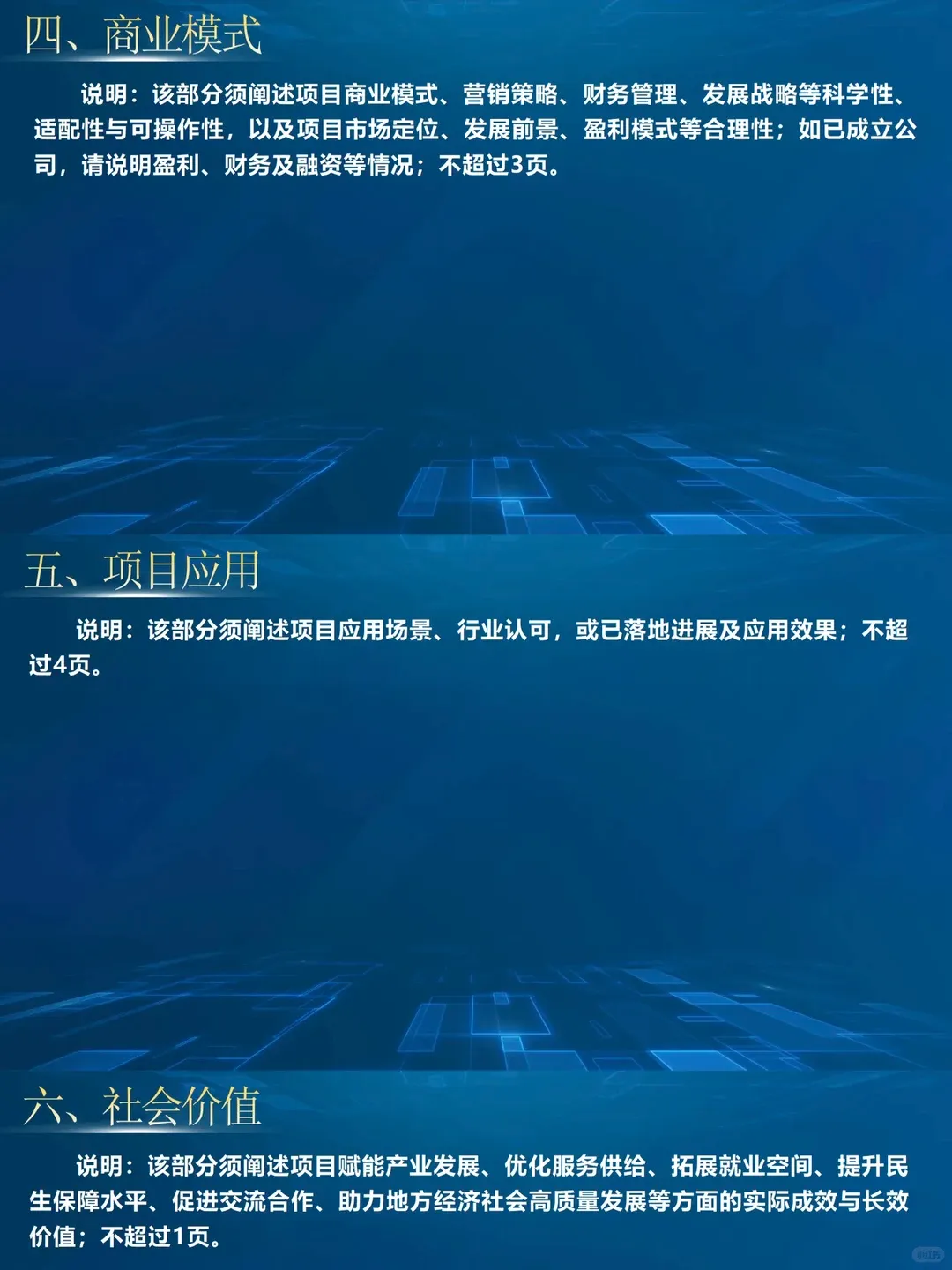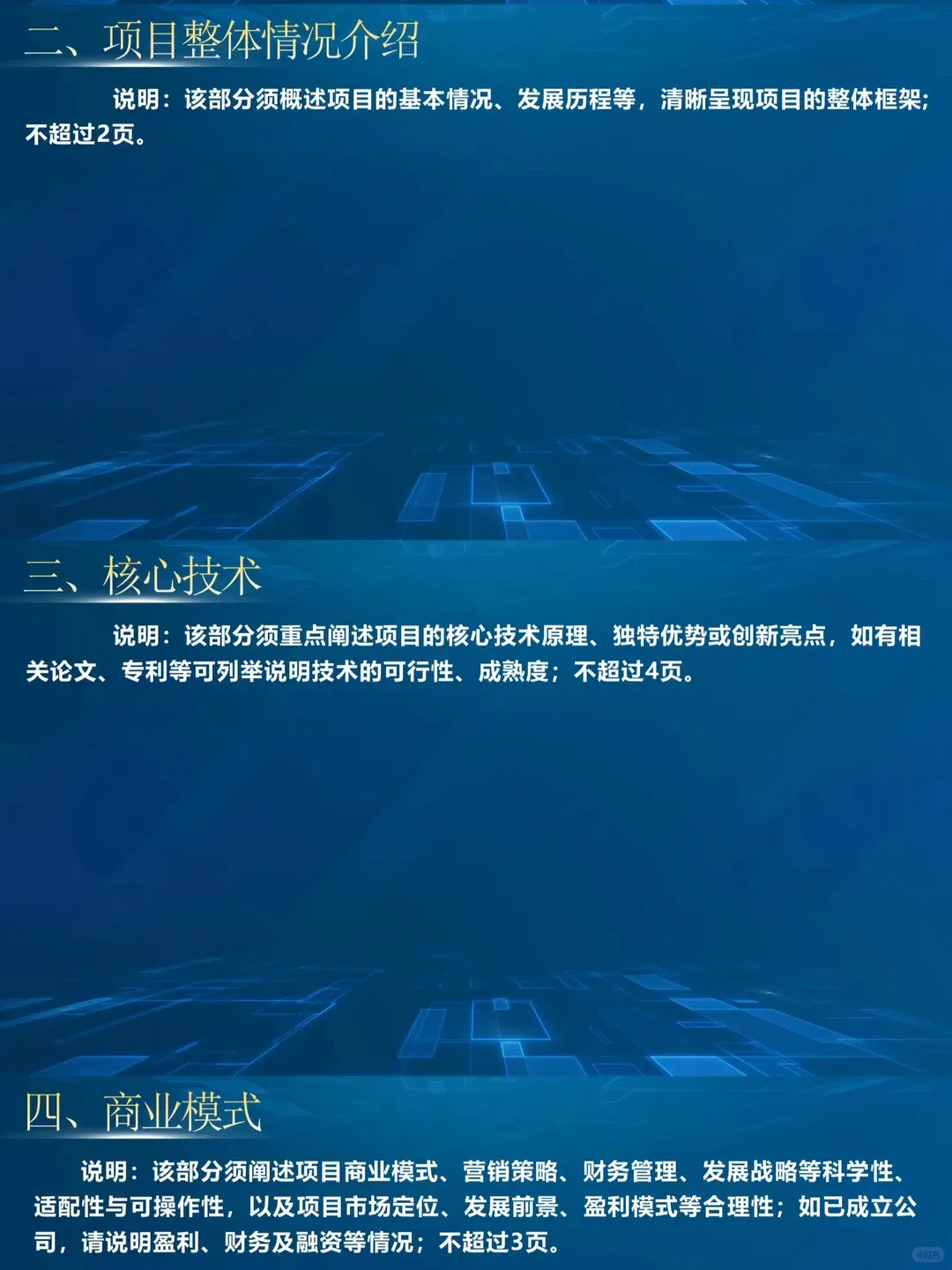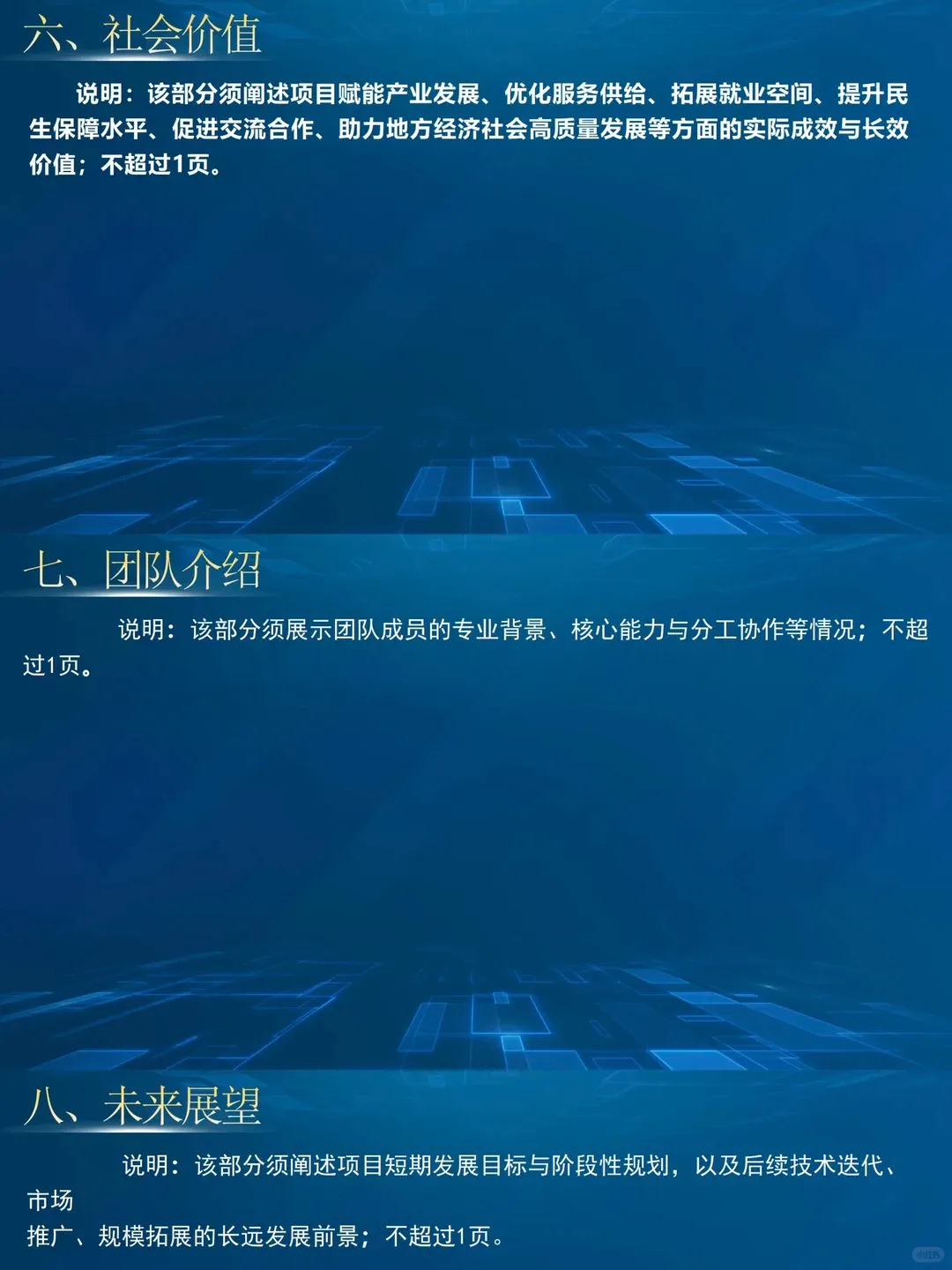 项目展示须围绕模板规定的8个部分呈现,内容完整,逻辑清晰,确无相关内容可删减对应页面,但不得调整顺序,不得偏离核心框架;背景颜色仅作为参考;各部分页数均不得超出说明规定的上限要求。