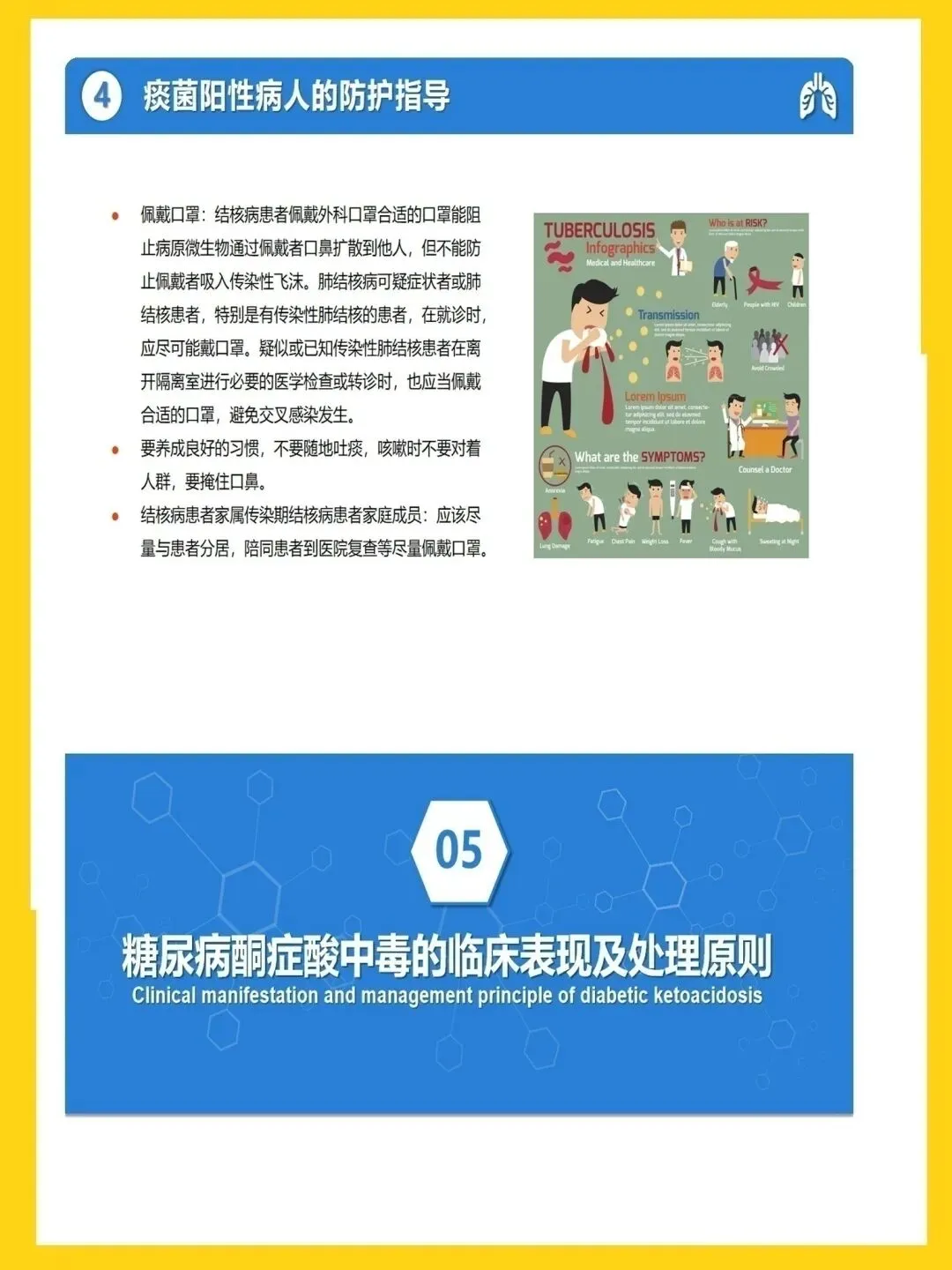 🍏主要内容:聚焦肺结核合并糖尿病护理查房,涵盖病情介绍、疾病知识、治疗用药、消毒隔离、急症处理及健康教育,为临床护理提供指导。