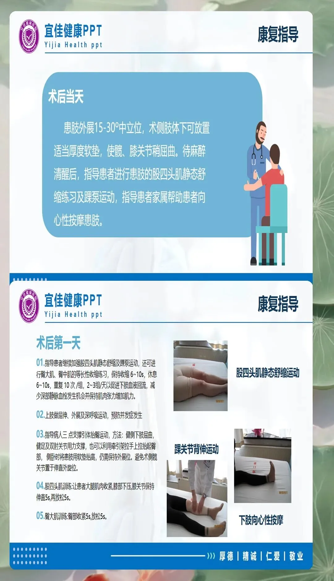 术后24小时是护理观察的关键期。需每小时监测生命体征直至平稳,观察意识状态、面色、口唇颜色,警惕脂肪栓塞综合征(呼吸急促、意识障碍、皮肤瘀斑)。体位管理是预防假体脱位的核心:髋关节置换患者需保持患肢外展中立位(外展15°—30°),双腿间放置梯形枕,绝对禁止交叉腿、盘腿、侧卧于患侧;内固定患者可适当抬高患肢20°—30°,促进静脉回流,减轻肿胀。翻身时采用轴式翻身法,保持躯干与患肢同步转动,避免髋关节屈曲超过90°。伤口护理需保持敷料清洁干燥,观察渗血、渗液及红肿热痛,引流管引流量<50ml/24h时考虑拔除。