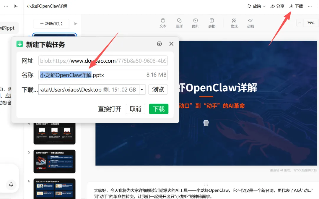 15分钟之后,整个ppt做好了,在右上角点击下载,选择ppt格式,把这玩意选到桌面,就下出来了。