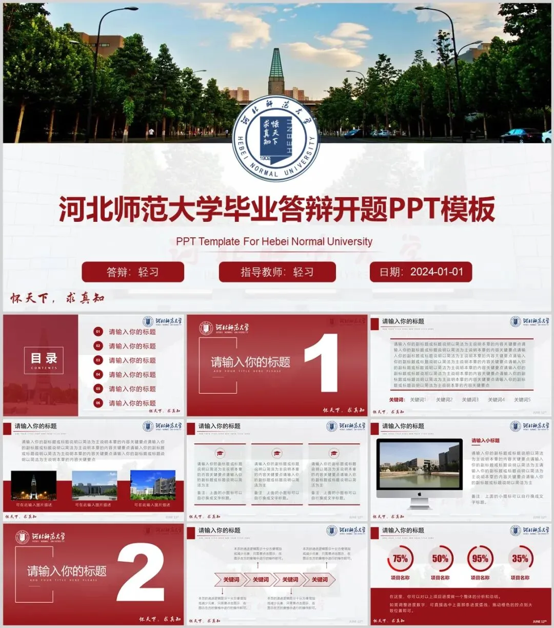包含了高校专属校徽,100+套精选PPT,正式大气中又不失高级活泼,很能展现个性与品位,适用于各种毕业答辩、总结汇报、活动策划、个人简历、宣传推广等场合。快快收好! 怀天下 求真知