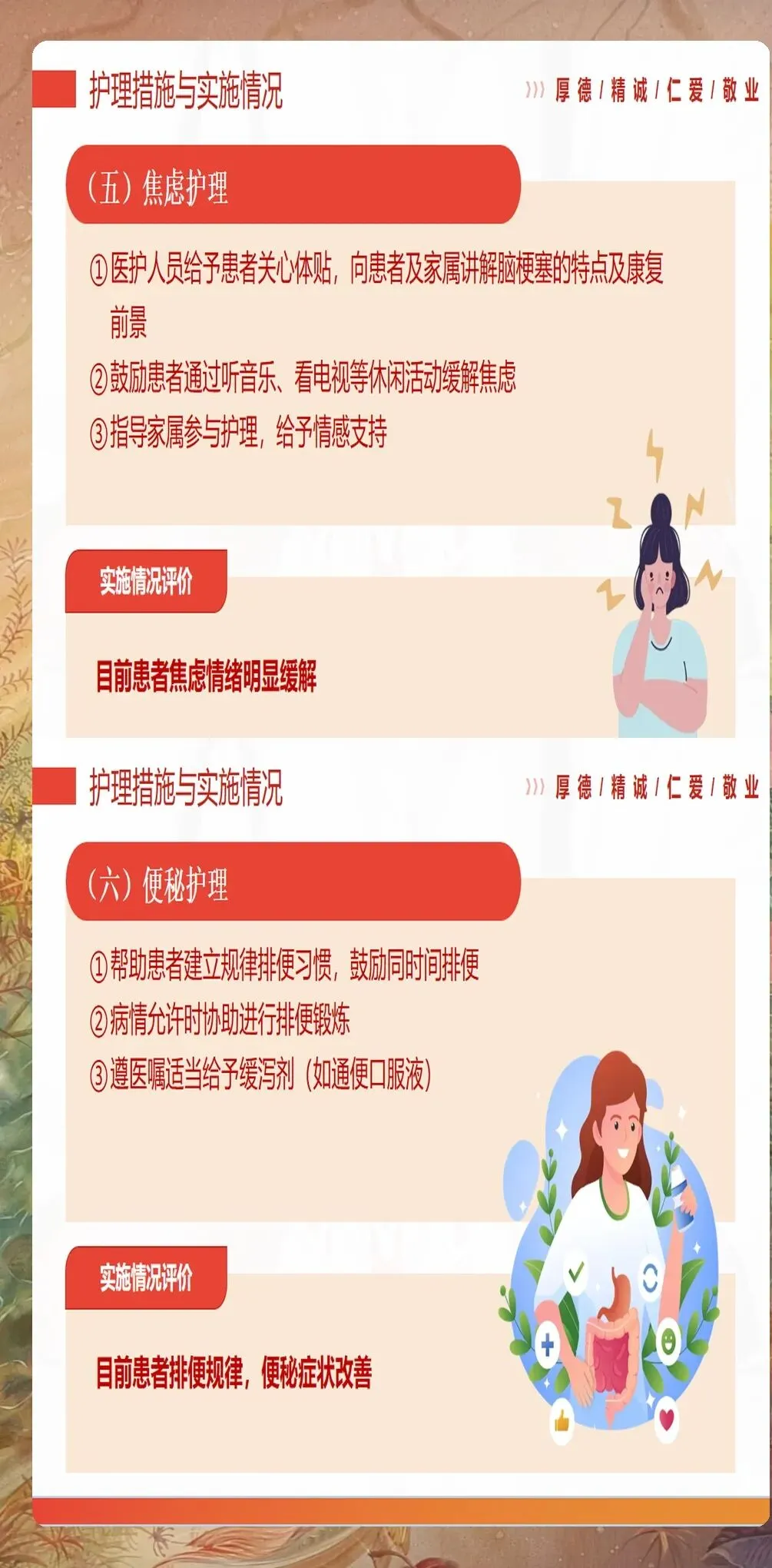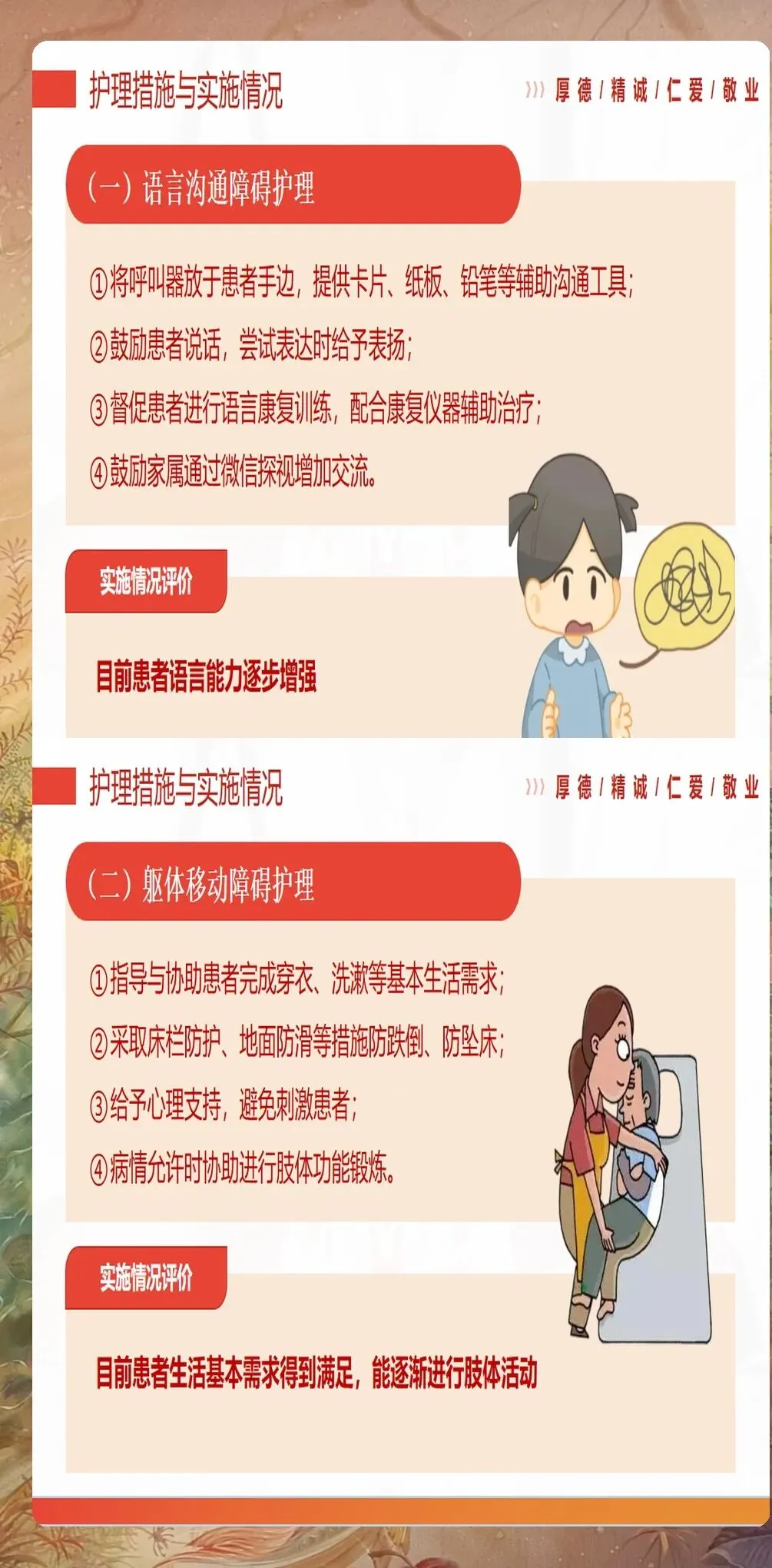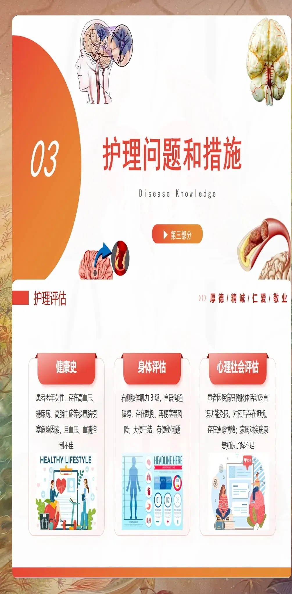 吞咽障碍在脑梗塞患者中发生率高达45%-65%,是导致误吸性肺炎和营养不良的主要原因。护理查房时必须进行规范的吞咽功能评估,采用洼田饮水试验或标准化吞咽功能评估量表。对于存在吞咽障碍的患者,应采取相应的干预措施:包括调整食物性状(如糊状食物)、采取正确的进食体位(坐位或床头抬高30-45度)、控制进食速度和量等。管饲患者的护理同样重要,要定期评估吞咽功能恢复情况,及时调整营养支持方案。