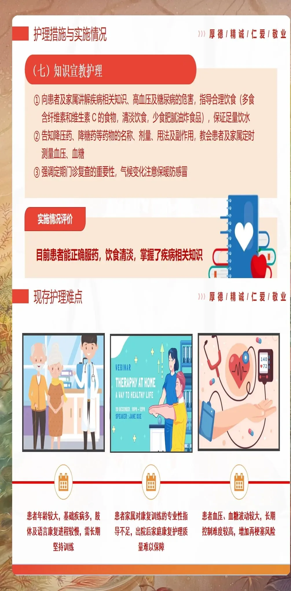 护理查房时要关注患者的出院准备情况,包括日常生活活动能力评估、家庭环境评估、照护者能力评估等。制定个体化的出院指导计划,包括用药指导、康复训练指导、并发症识别和应对、复诊安排等。建立延续护理机制,通过电话随访、家庭访视等方式,确保患者在院外能够继续获得专业的护理指导和支持。