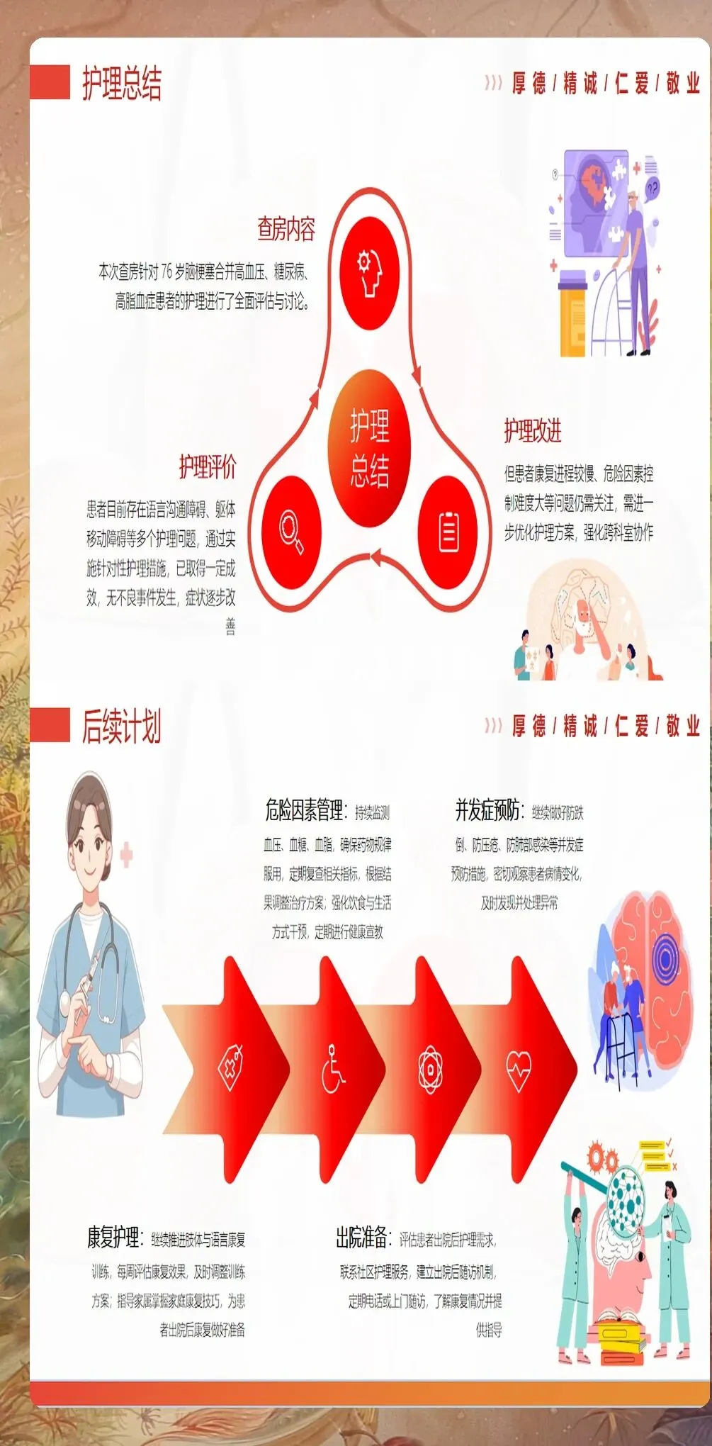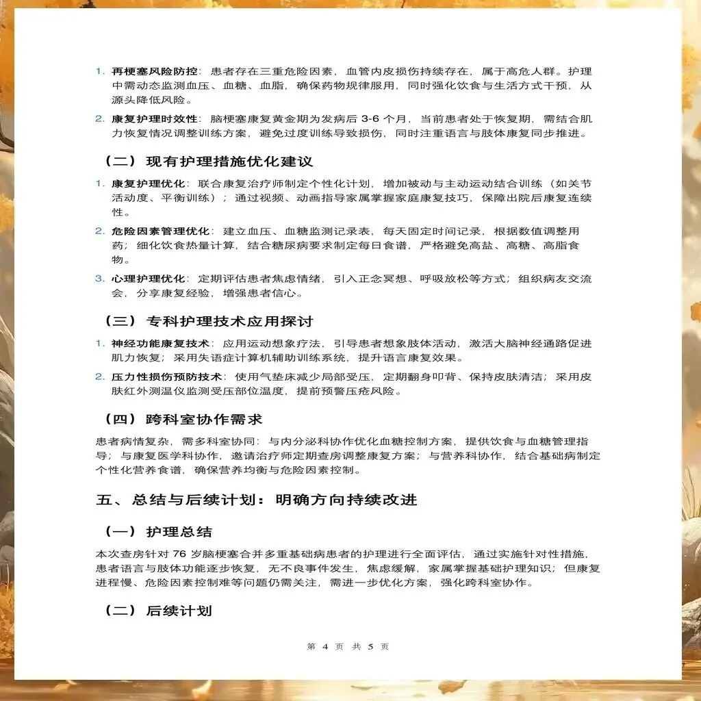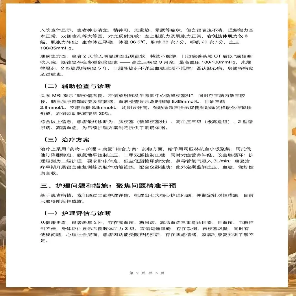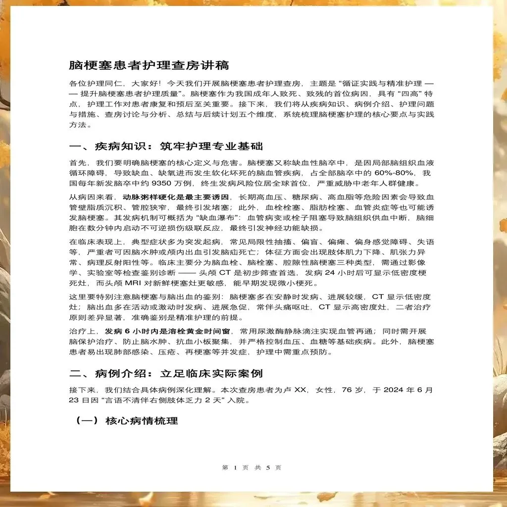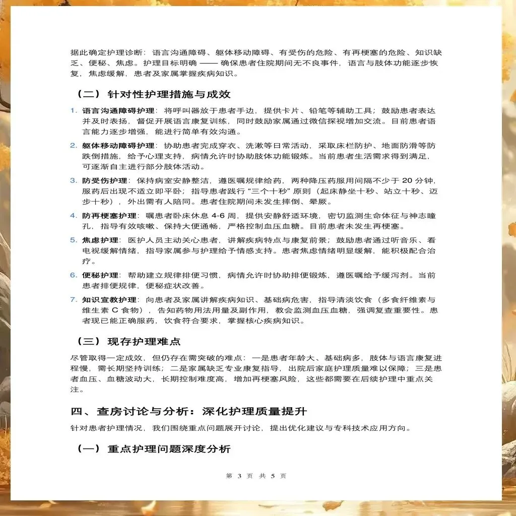 脑梗塞患者的护理查房是一个系统工程,需要护理人员具备扎实的专业知识、敏锐的观察能力和有效的沟通协调能力。通过规范化的查房实践,能够及时发现护理问题,调整护理方案,最终改善患者的功能结局和生活质量。护理查房不仅是护理质量的保障措施,更是护理人员专业能力提升的重要途径。
