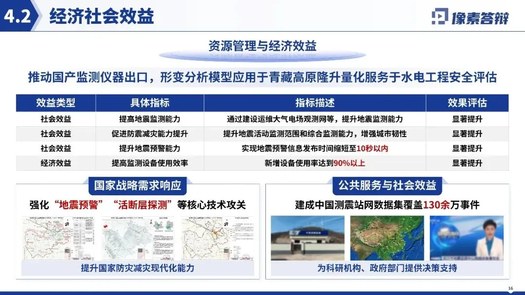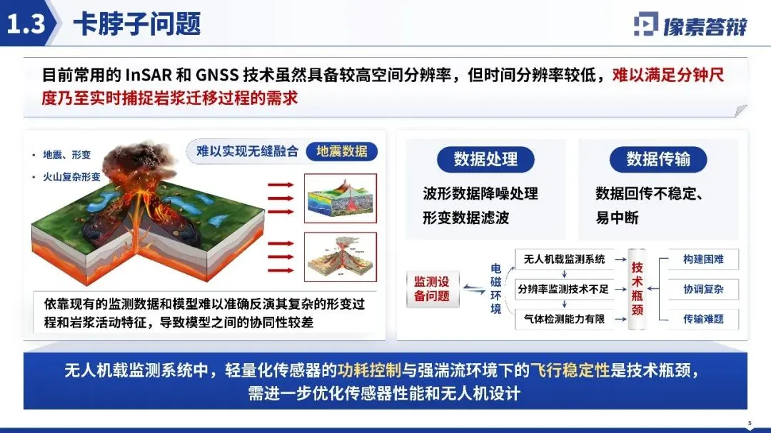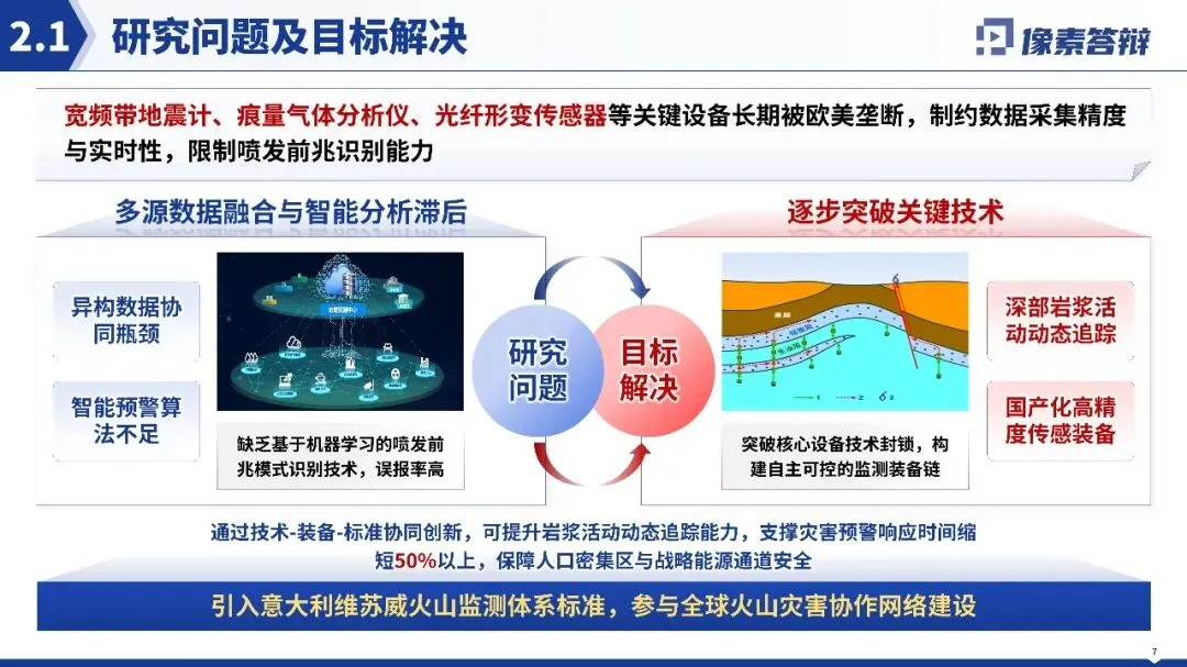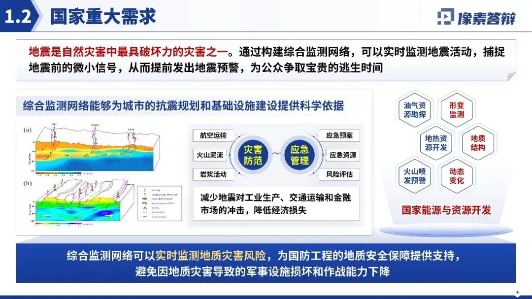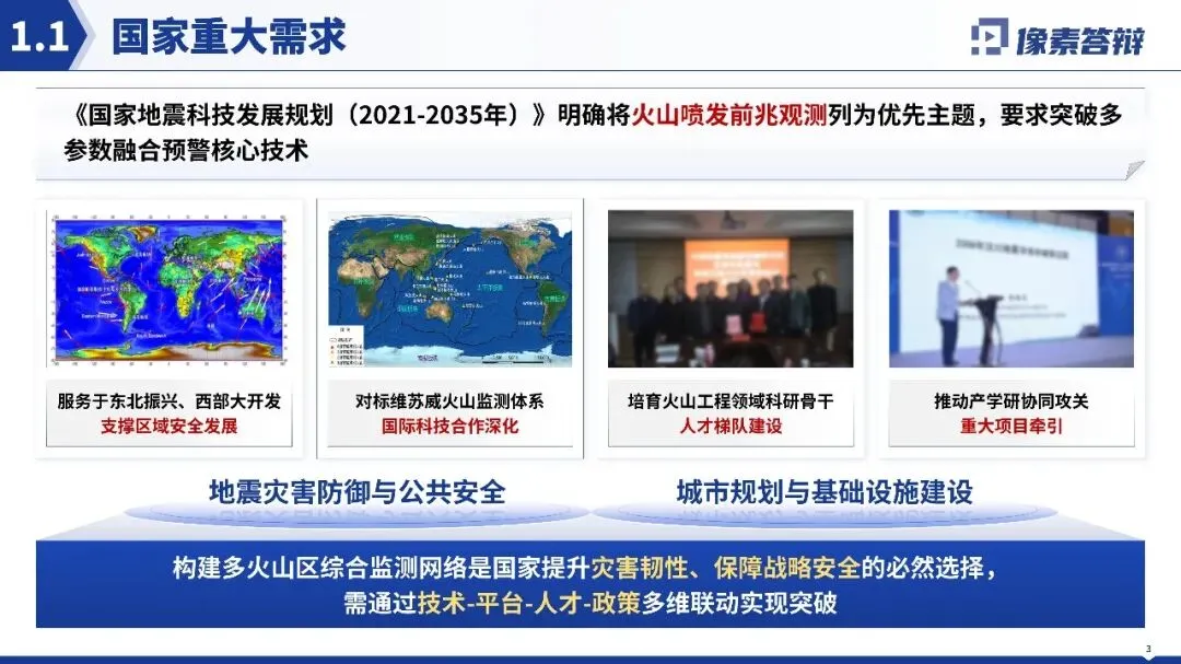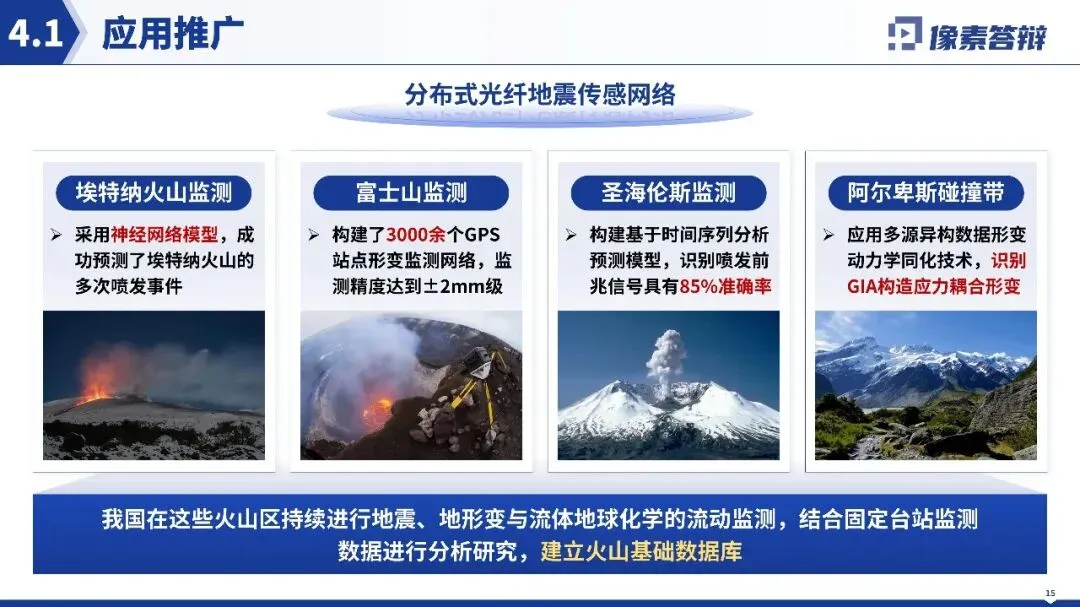 视觉风格高度统一且贴合项目属性,以蓝色系为主色调,契合火山地震监测的科技感与专业感,搭配的地质图、技术原理图等均为高分辨率专业科研素材,无花哨装饰元素,纯素背景打造极简科技风,整体视觉干净高级。