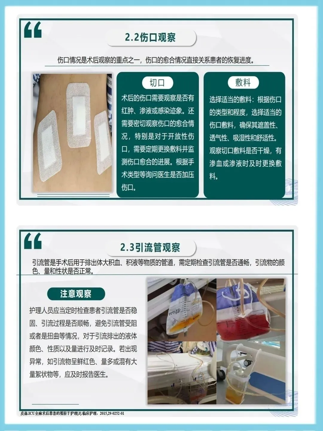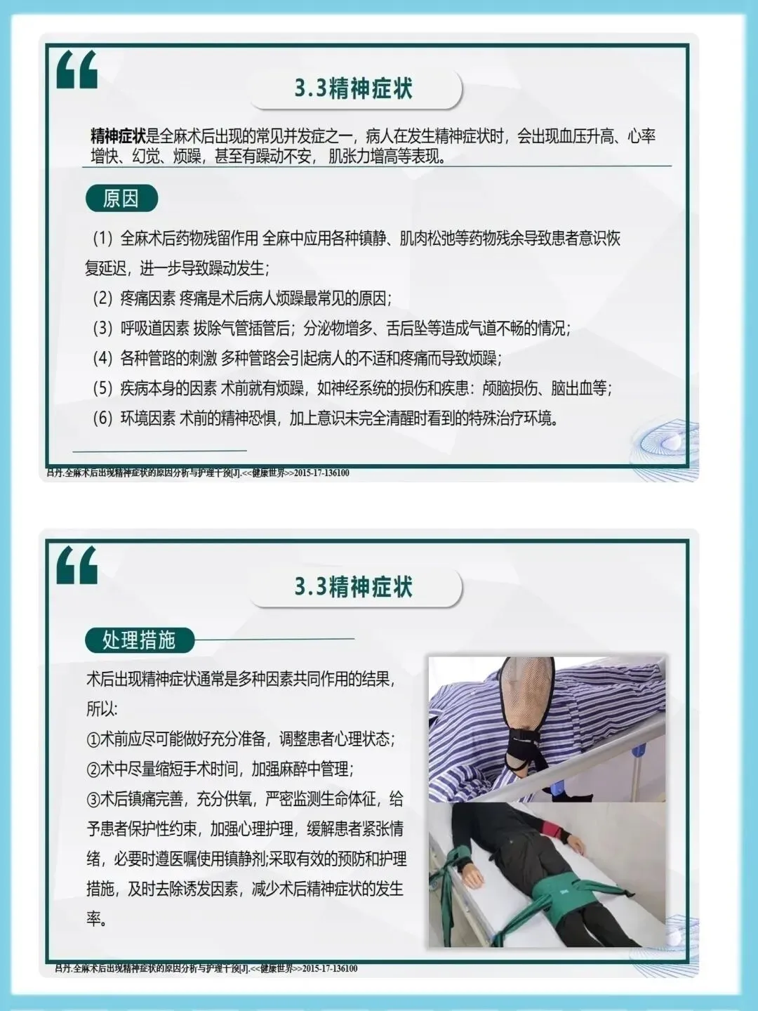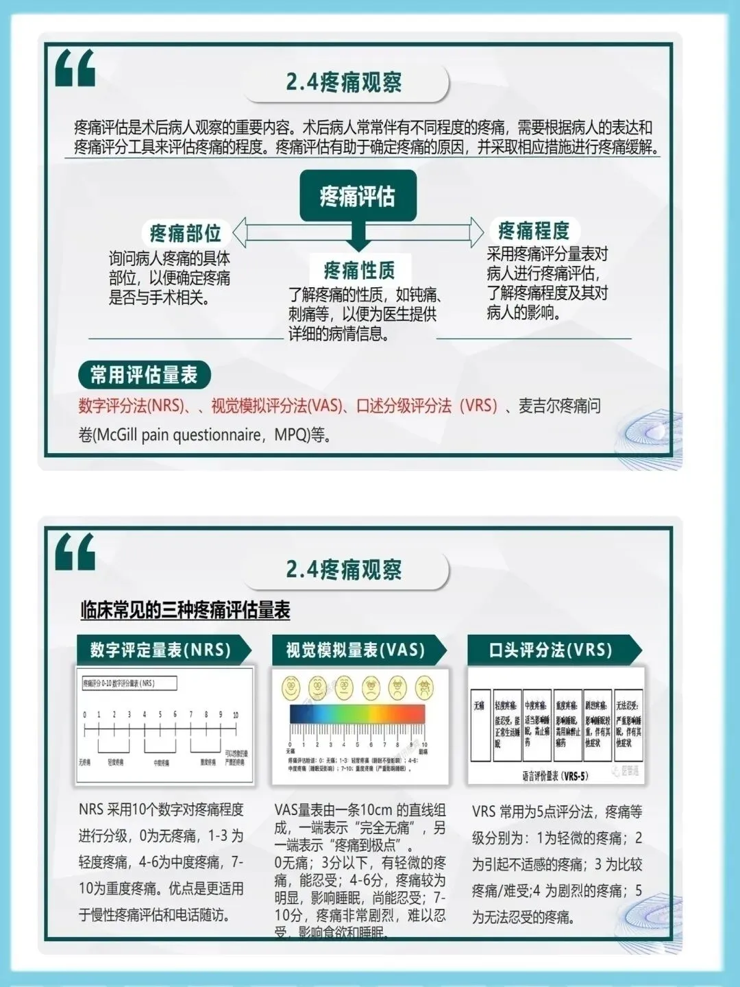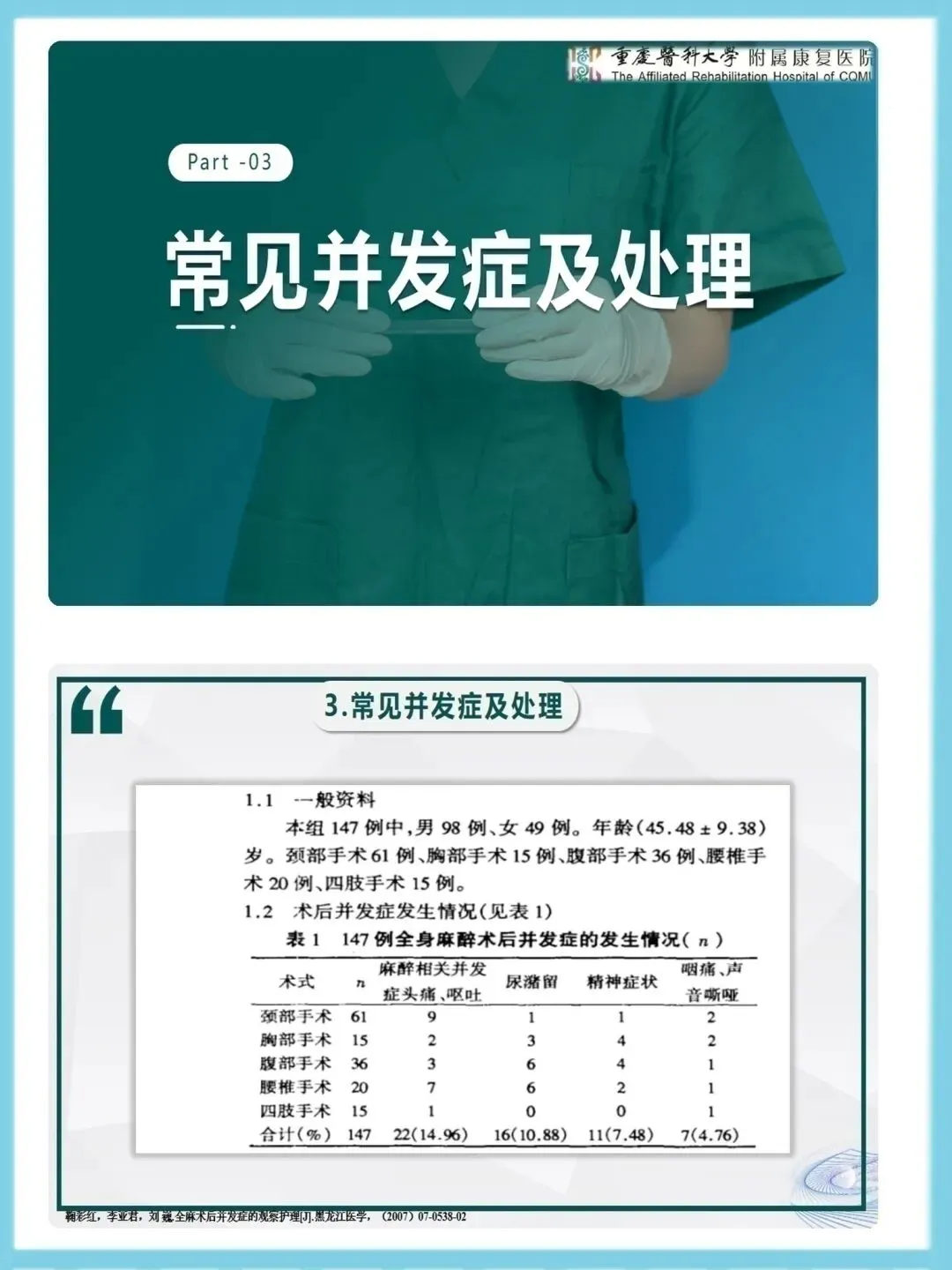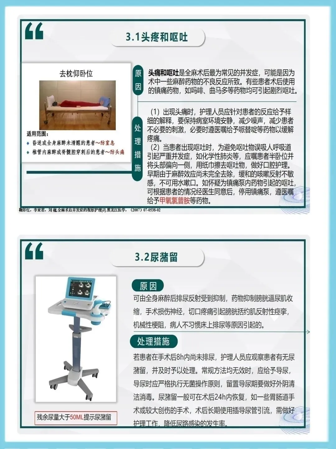 全身麻醉是通过呼吸道、静脉或肌肉注入麻醉药,抑制中枢神经系统的麻醉方式,分吸入、静脉、复合麻醉三类,术后因麻醉药物残留等因素,需严密开展各项观察护理工作。术后观察以生命体征为基础,需定时监测体温、脉搏、血压、呼吸,关注其数值是否在正常范围,同时重点观察伤口愈合、敷料情况,以及引流管通畅度和引流物的颜色、量、性状。疼痛评估是术后观察重要内容,需明确疼痛部位、性质,采用NRS、VAS、VRS等量表评估疼痛程度,区分切口创伤性疼痛与深在性疼痛,为镇痛干预提供精准依据。全麻术后易出现头痛呕吐、尿潴留、精神症状等并发症,需针对病因及时处理,如呕吐时头偏向一侧防误吸,尿潴留无效时无菌导尿,躁动时做好保护性约束。此外,需警惕术后出血、感染、静脉血栓等严重并发症,严密监测出血征象,严格无菌操作,鼓励患者早期活动,做好下肢静脉血栓预防,及时干预异常情况,降低并发症风险。全麻术后观察护理需全面、细致、及时,把控每一个护理环节,精准识别并处理各类问题,才能有效促进患者术后恢复,减少并发症发生。