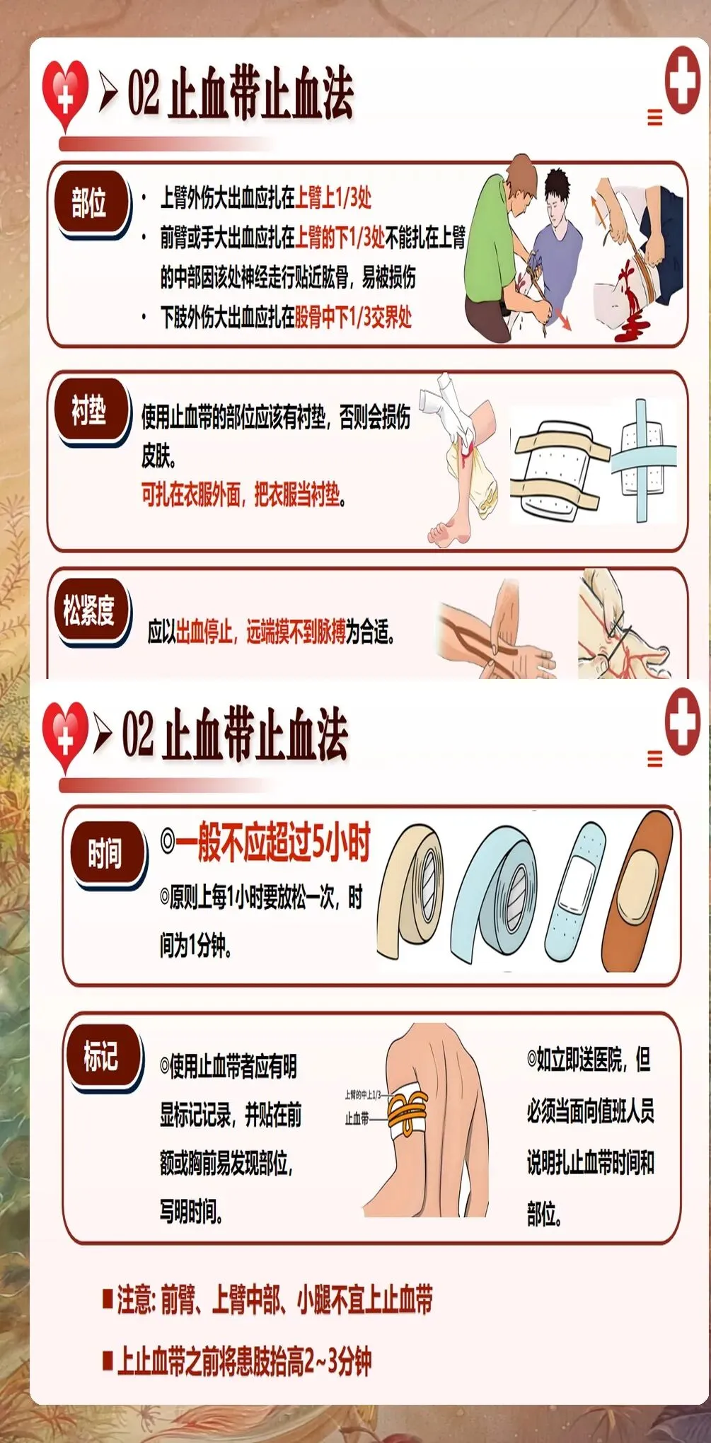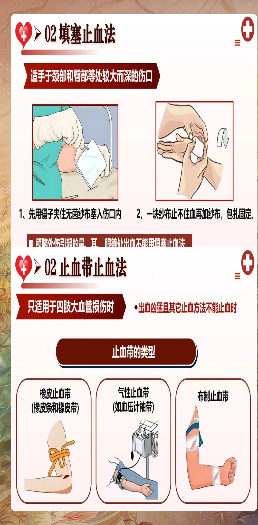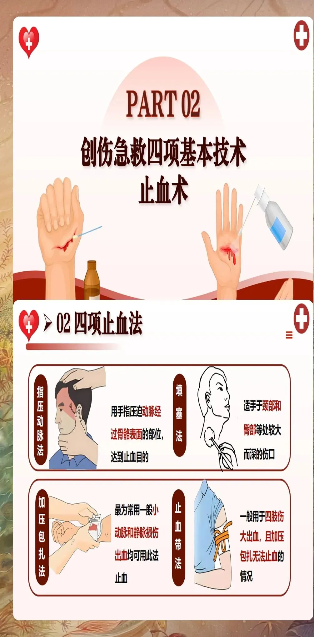 止血技术是创伤急救的首要环节,失血过多是创伤早期死亡的主要原因。根据出血类型不同,需要采取相应的止血方法。指压止血法是最直接有效的临时止血措施,通过压迫出血点近端的动脉来阻断血流,适用于四肢大出血的紧急处理。但需要注意的是,指压止血只是临时措施,止血带的应用则更为重要和持久。止血带应放置在伤口近端的健康组织上,避免直接压迫伤口或骨折部位,同时要记录止血带的安放时间,每隔90分钟至2小时需要松解一次,避免肢体缺血坏死。填塞止血法适用于深部伤口或腔隙出血,通过无菌敷料填塞压迫达到止血目的。在实际操作中,要根据出血部位、出血量和伤者具体情况选择最合适的止血方法。