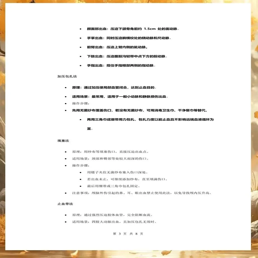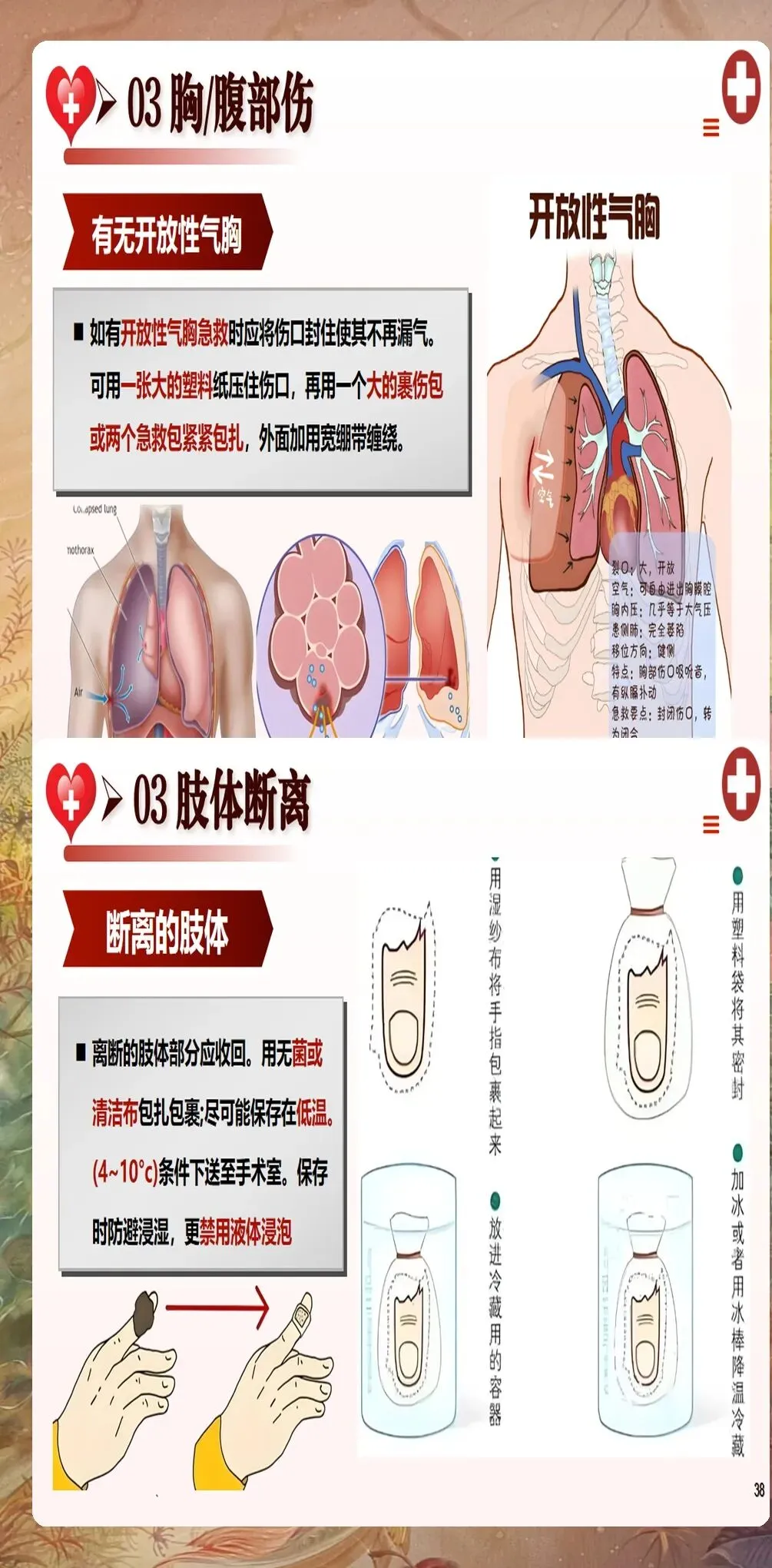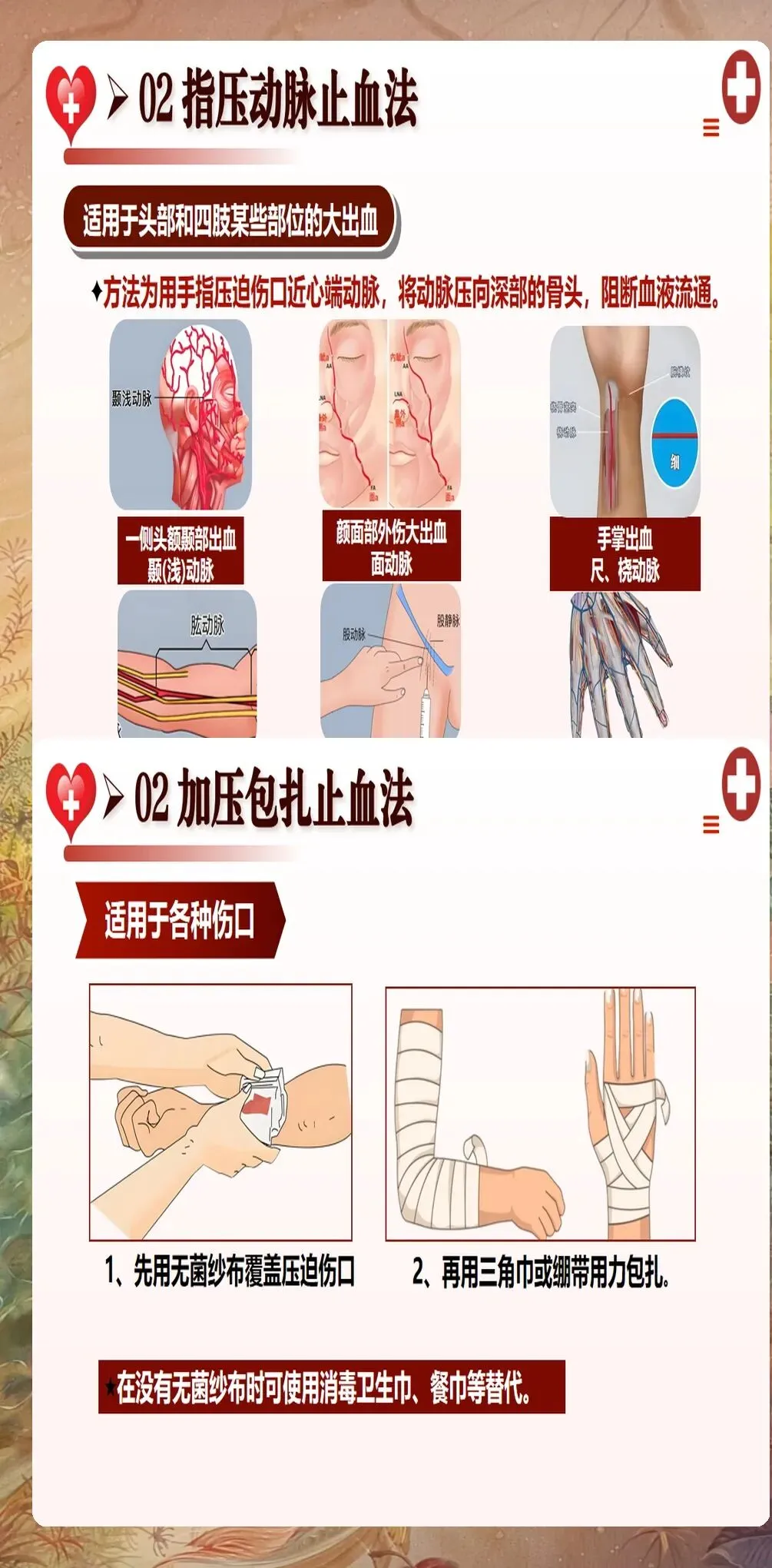 止血技术是创伤急救的首要环节,失血过多是创伤早期死亡的主要原因。根据出血类型不同,需要采取相应的止血方法。指压止血法是最直接有效的临时止血措施,通过压迫出血点近端的动脉来阻断血流,适用于四肢大出血的紧急处理。但需要注意的是,指压止血只是临时措施,止血带的应用则更为重要和持久。止血带应放置在伤口近端的健康组织上,避免直接压迫伤口或骨折部位,同时要记录止血带的安放时间,每隔90分钟至2小时需要松解一次,避免肢体缺血坏死。填塞止血法适用于深部伤口或腔隙出血,通过无菌敷料填塞压迫达到止血目的。在实际操作中,要根据出血部位、出血量和伤者具体情况选择最合适的止血方法。