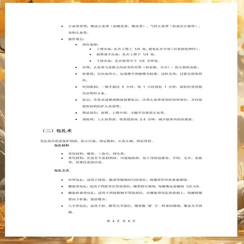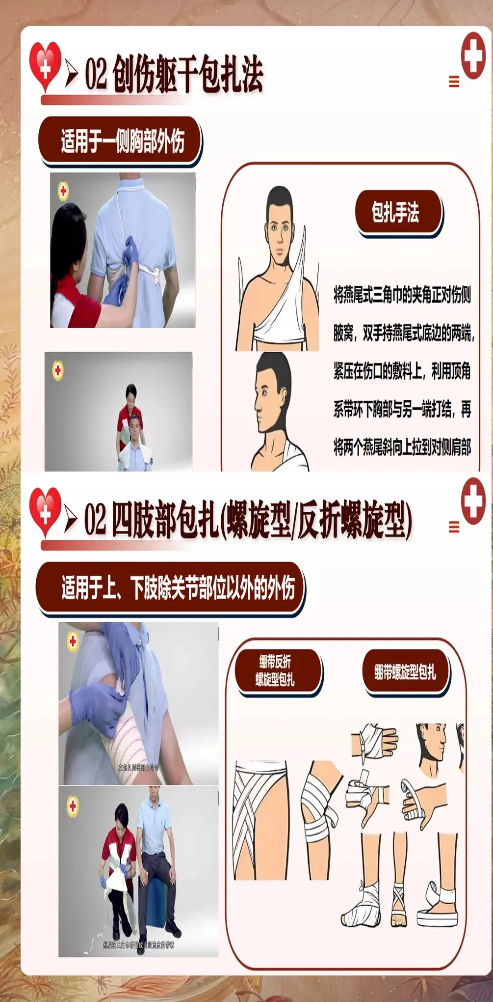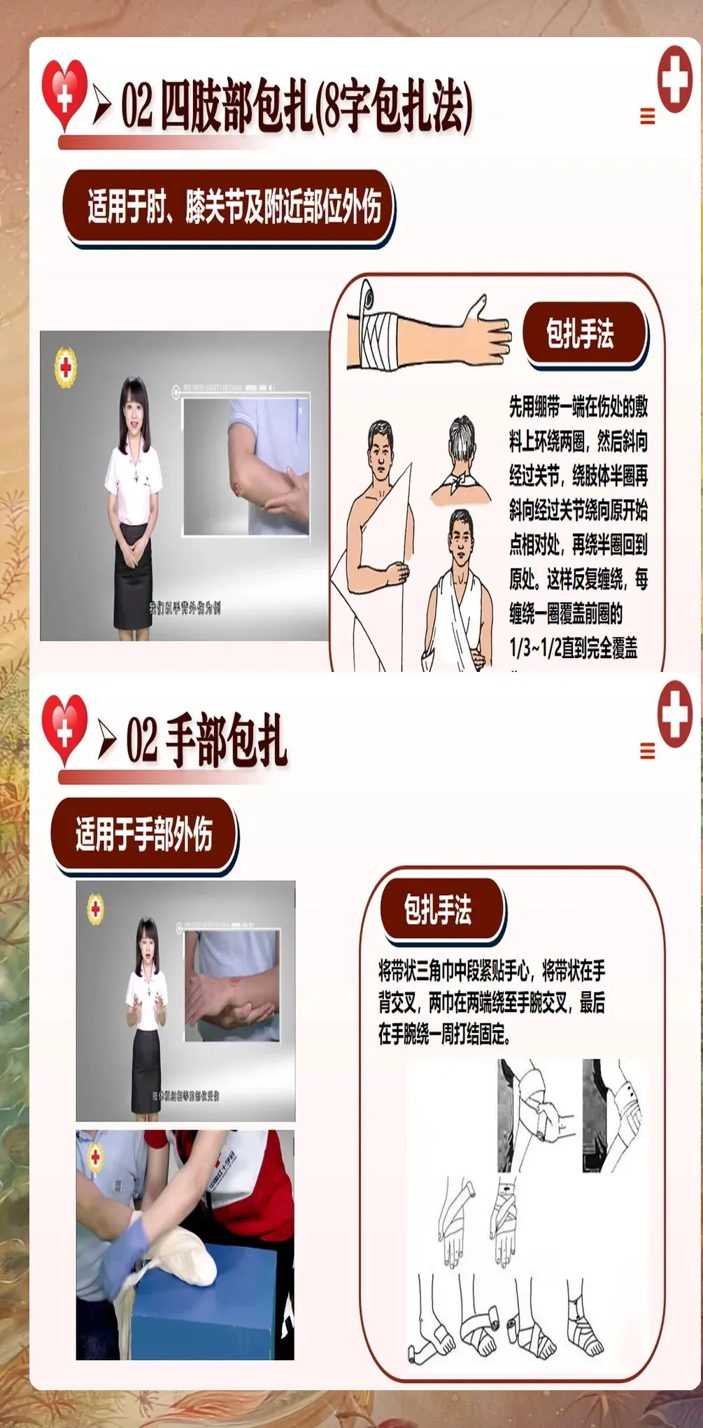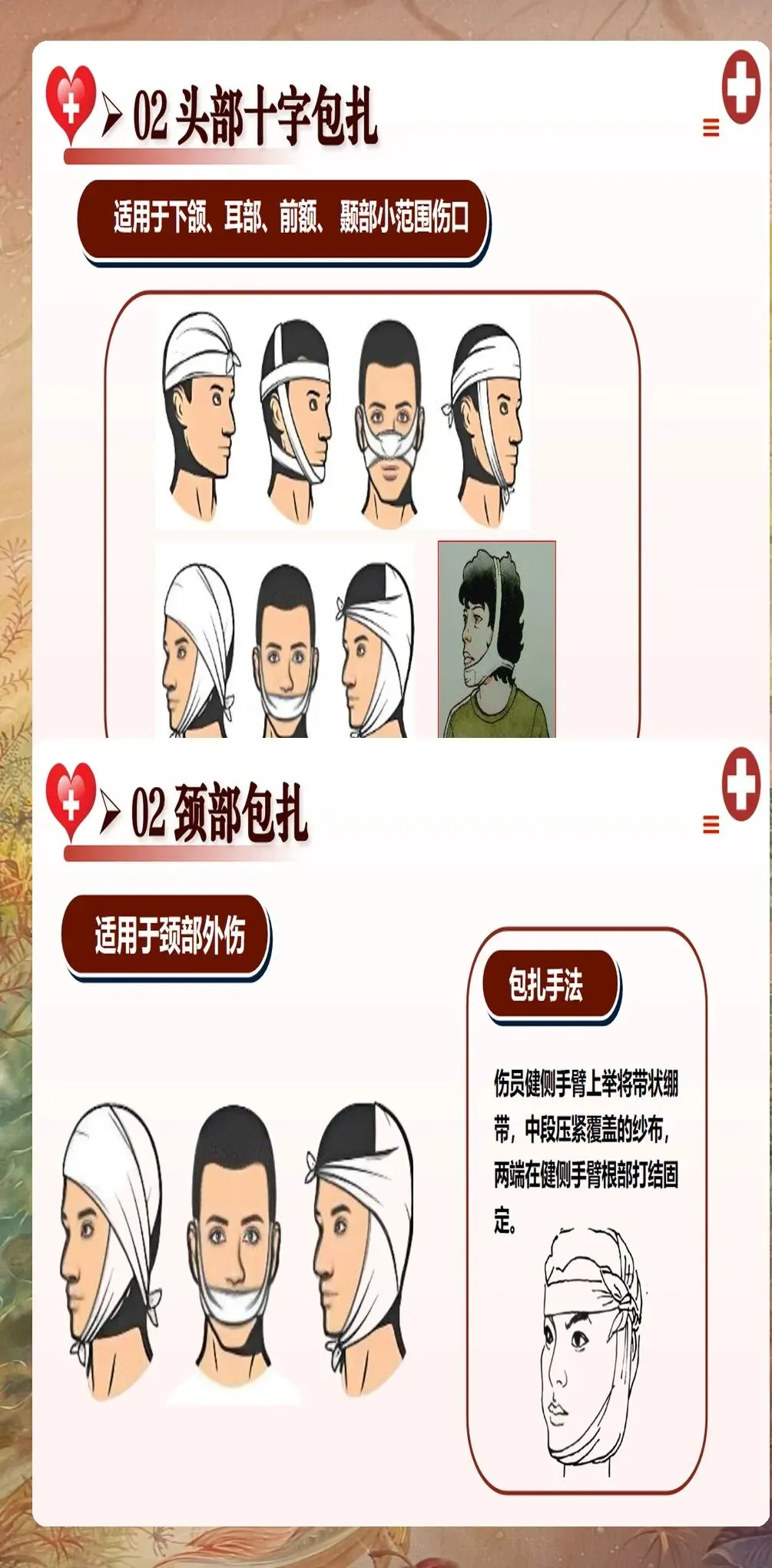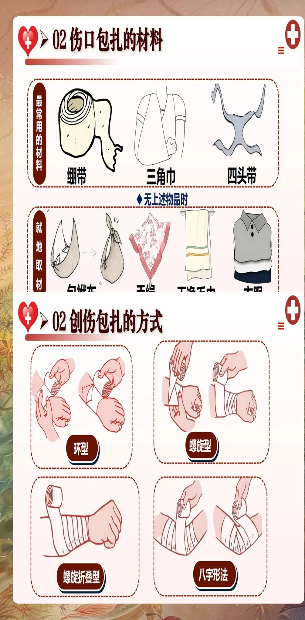 包扎技术在创伤急救中具有止血、保护伤口、固定敷料等多重作用。包扎材料的选择应基于伤口性质和环境条件,无菌敷料是首选,但在紧急情况下也可使用清洁的布料替代。包扎时要遵循"先清洁、后包扎"的原则,避免将污物带入伤口深处。螺旋包扎法适用于四肢,环形包扎法用于额头、手腕等小范围部位,8字包扎法则适用于关节部位,能够兼顾固定和活动。包扎力度要适中,既要达到止血效果,又不能过紧影响血液循环。特别是对于四肢包扎,要定期检查远端循环情况,如出现苍白、麻木、肿胀等症状,应立即松开重新包扎。对于严重污染伤口,包扎前应进行必要的清创处理,但深度清创应在有条件的医疗机构进行。