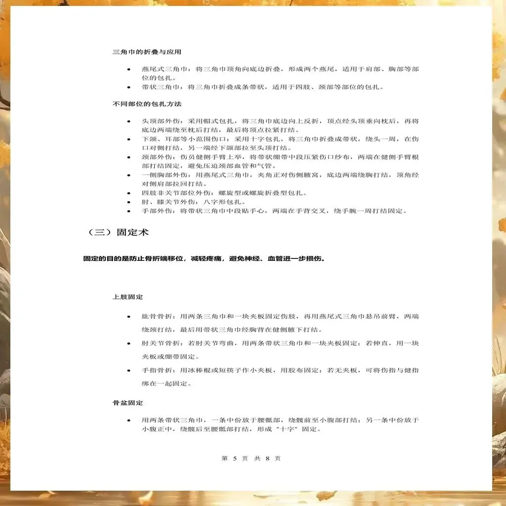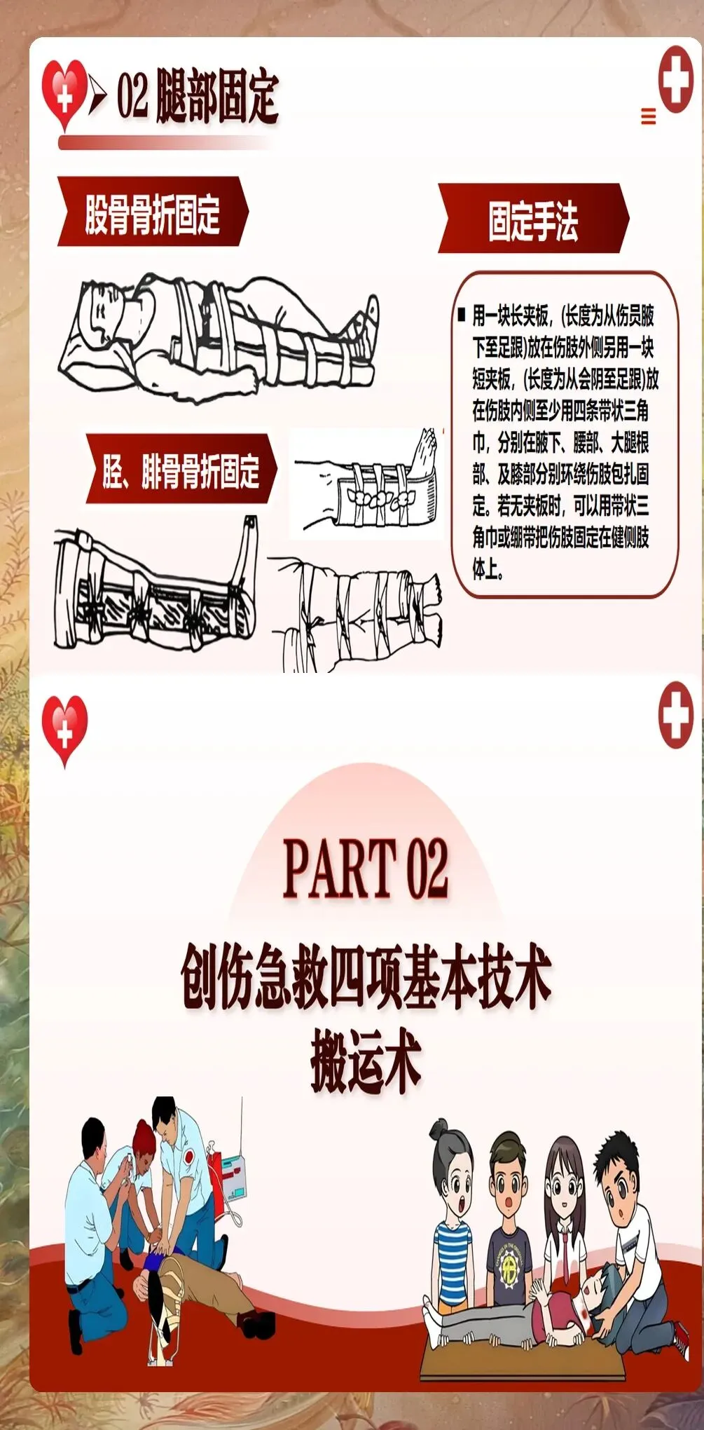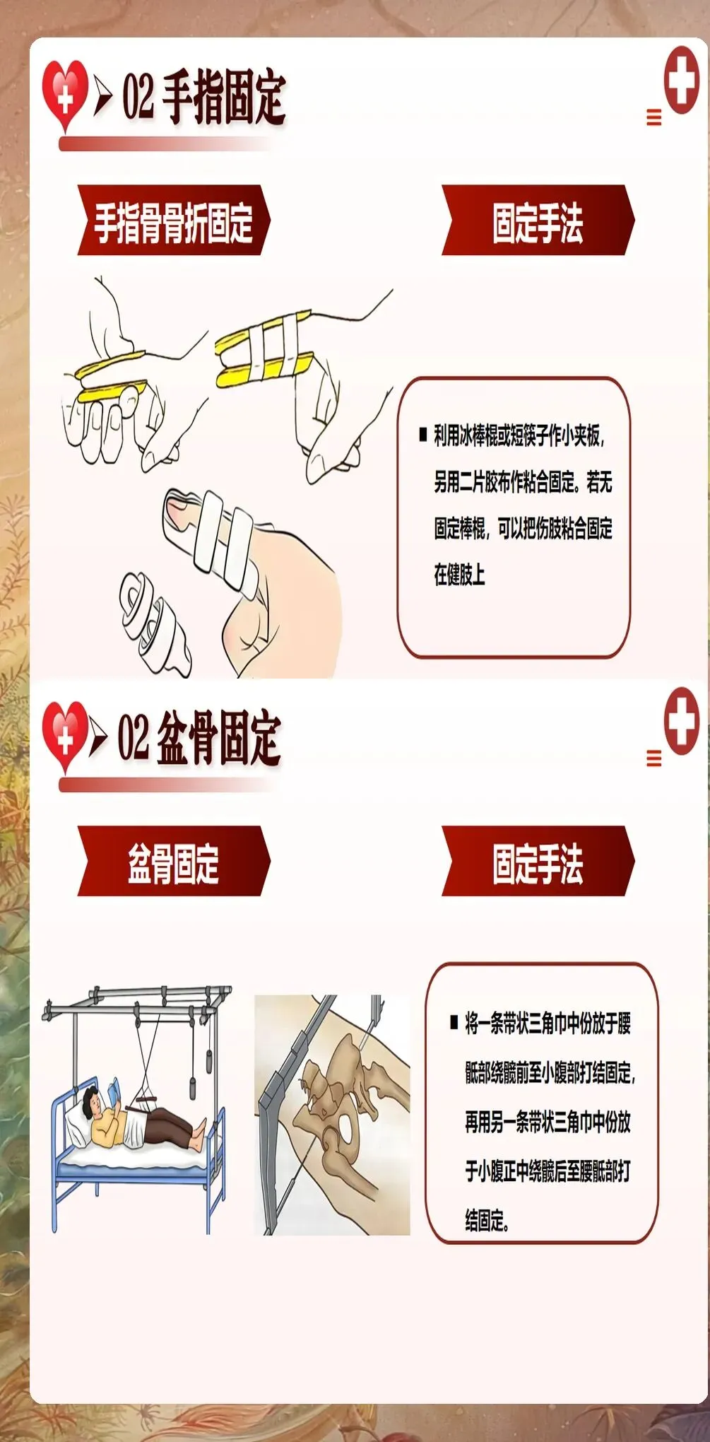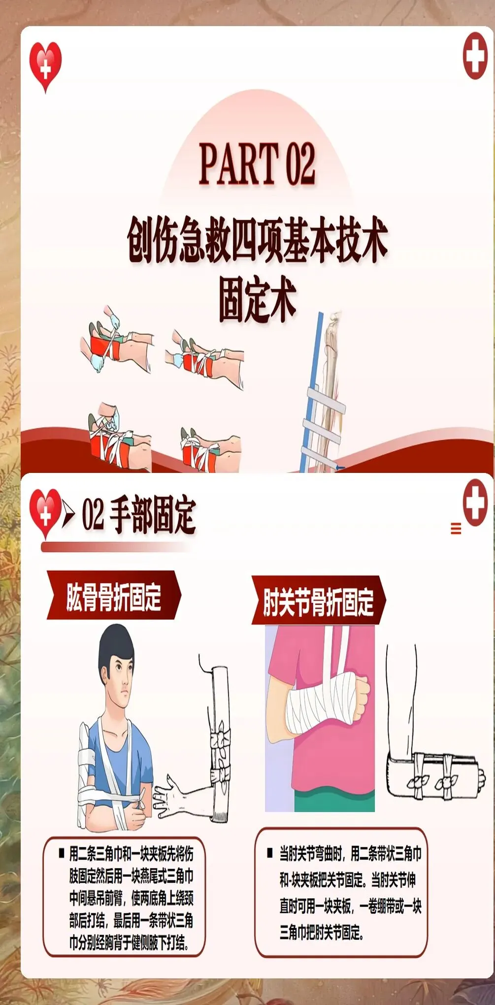 固定技术是创伤急救中容易被忽视但至关重要的一环,特别是对于骨折、关节脱位等损伤,及时的固定能够有效减轻疼痛、防止二次损伤。固定材料包括夹板、支具、健肢固定等多种形式,其中夹板固定是最常用的方法。固定操作时要注意超越骨折部位的上下两个关节,确保固定的稳定性。对于开放性骨折,固定时要避免骨折端直接接触夹板,可用敷料包裹。固定过程中要密切观察伤者的生命体征,特别是固定后的肢体循环状况。需要特别强调的是,在固定前应先进行必要的止血和包扎处理,固定后要做好标记,注明固定时间和伤者基本情况。