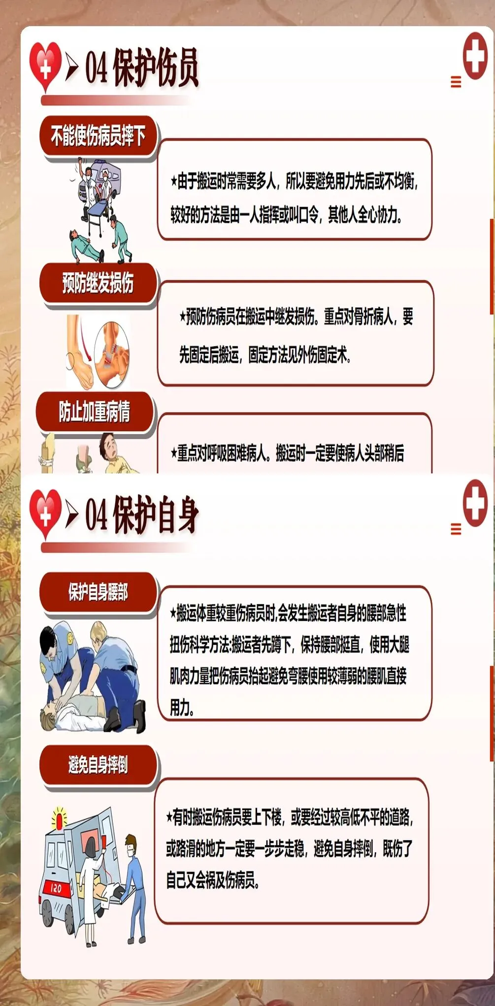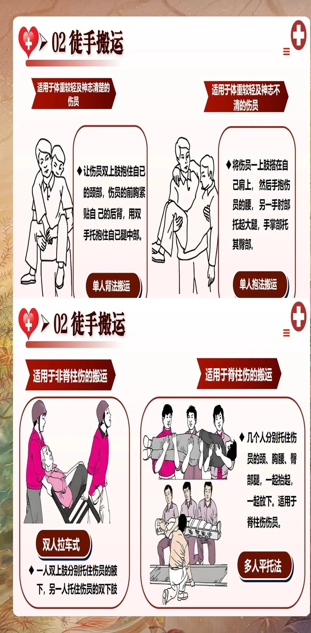 搬运技术是创伤现场急救的最后环节,也是连接现场救治和院内治疗的重要桥梁。正确的搬运能够避免伤者受到二次伤害,特别是对于脊柱损伤患者,不当的搬运可能导致终身残疾。单人搬运适用于意识清醒、能够配合的轻伤员,包括背负法、抱持法等。双人搬运法适用于下肢骨折、躯干损伤等情况,通过两人协调配合确保搬运安全。三人平托法是脊柱损伤患者的标准搬运方法,三人分别位于头部、躯干和下肢部位,保持脊柱在一条直线上进行整体搬运。担架搬运适用于重伤员,使用担架时要确保伤者固定稳妥,避免转运途中晃动。在特殊环境下,如高处坠落、狭窄空间等,需要采用专门的搬运技术和设备。