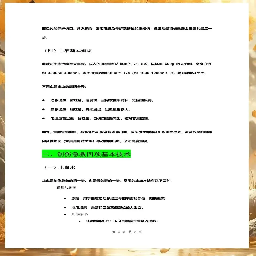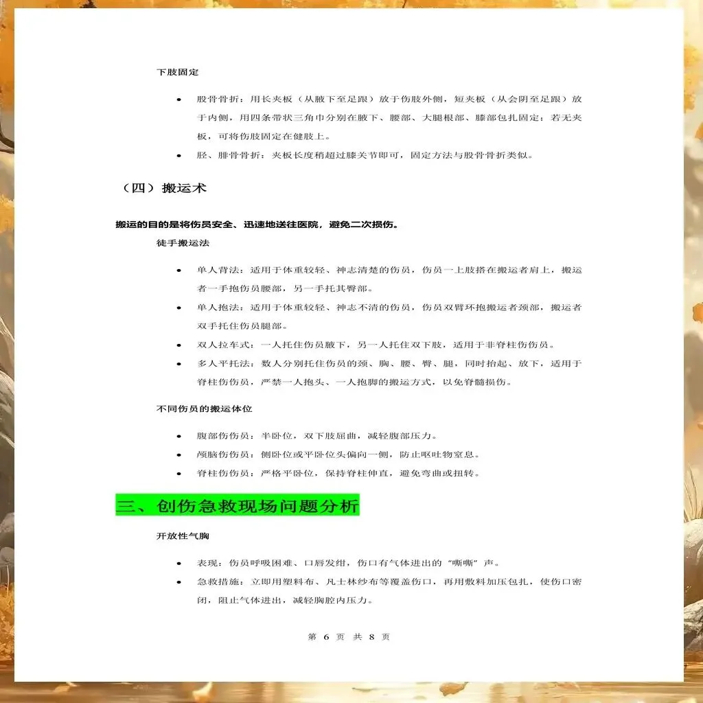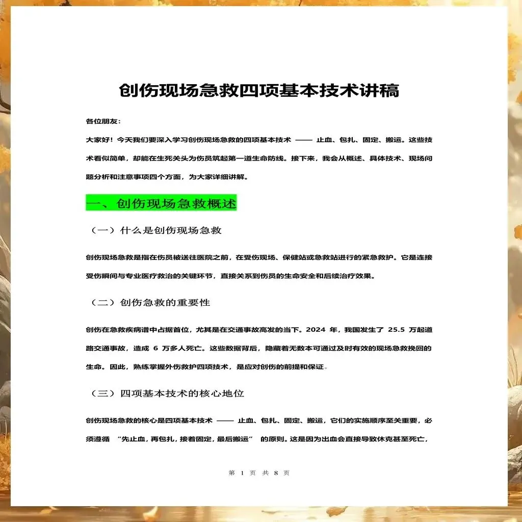 创伤现场急救四项基本技术看似简单,但要在紧急情况下正确应用,需要扎实的基础知识和丰富的实践经验。作为医护人员,我们要时刻牢记,每一次正确的现场急救,都可能挽救一个生命,一个家庭。只有不断学习、反复练习、总结经验,才能在关键时刻发挥重要作用,为创伤患者争取宝贵的救治时机。
