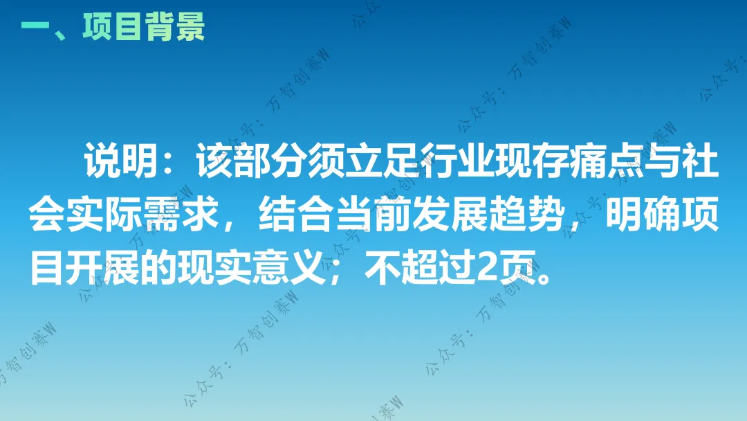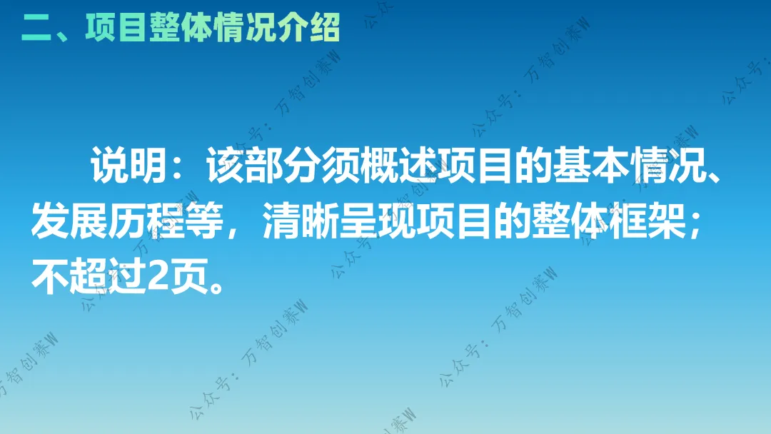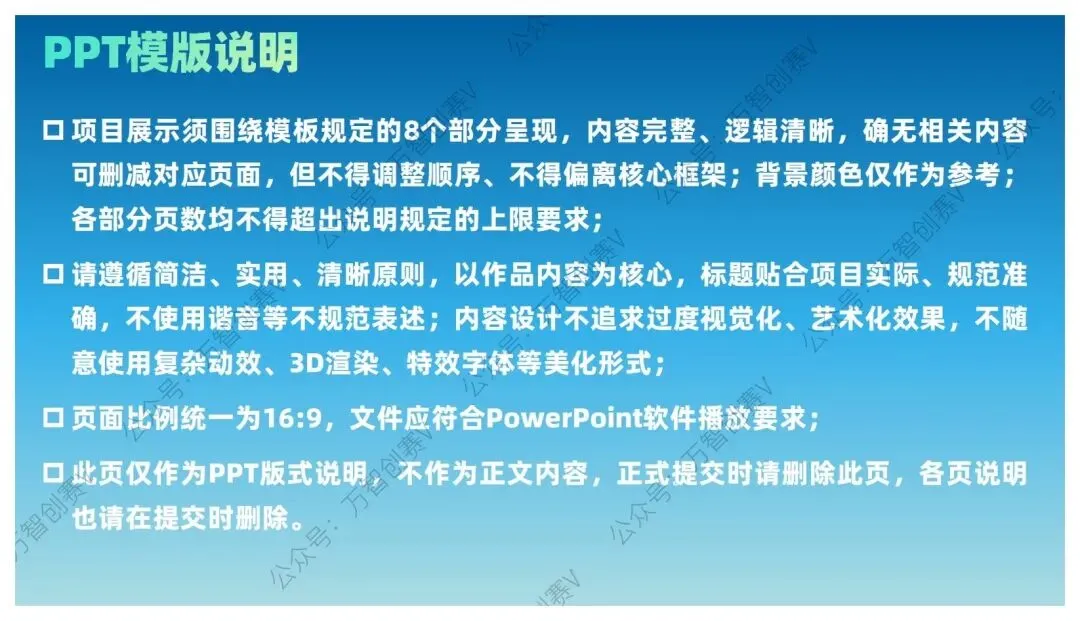 1. 框架不可调整:项目展示必须严格按照模板规定的8个部分呈现,不得调整顺序、不得偏离核心框架,确无相关内容可删减对应页面,但绝对不能改动整体结构。