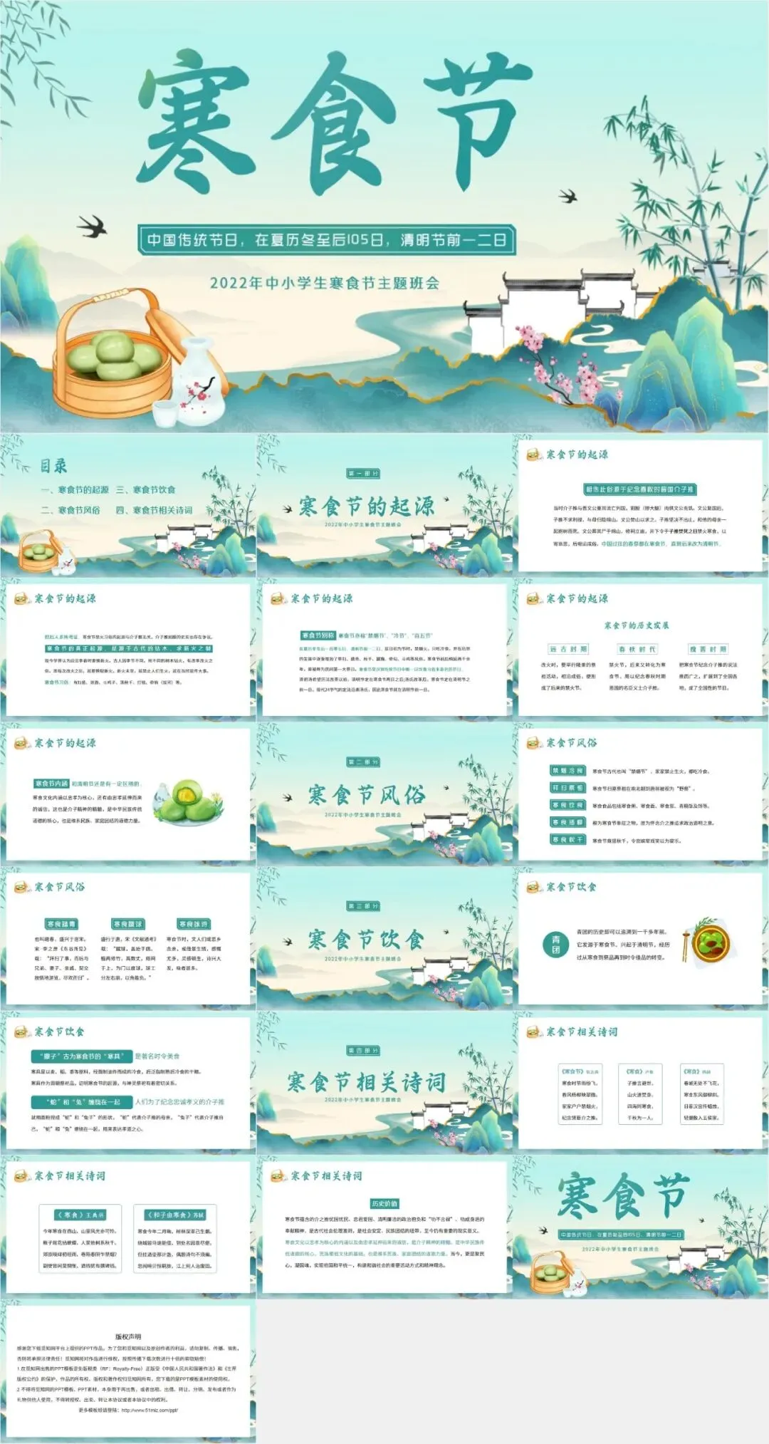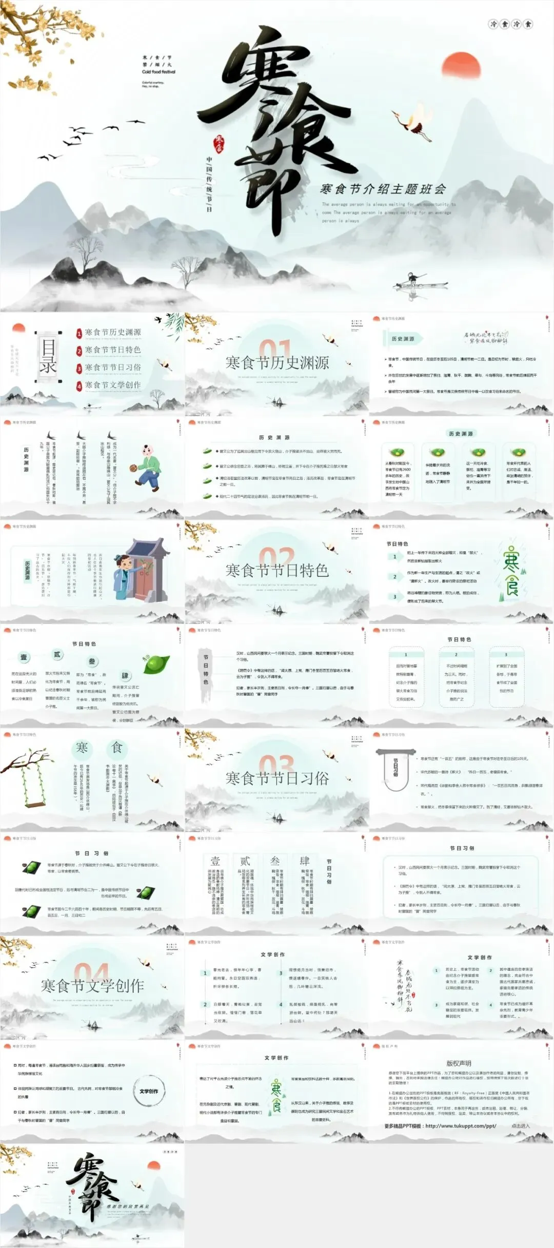 每页设计融入古风元素,脉络清晰好排版,无论是课堂分享、文化科普还是节日活动都适用。让千年寒食的忠孝内涵与春日雅趣,随一页页幻灯片缓缓流淌解锁传统节日的诗意表达!