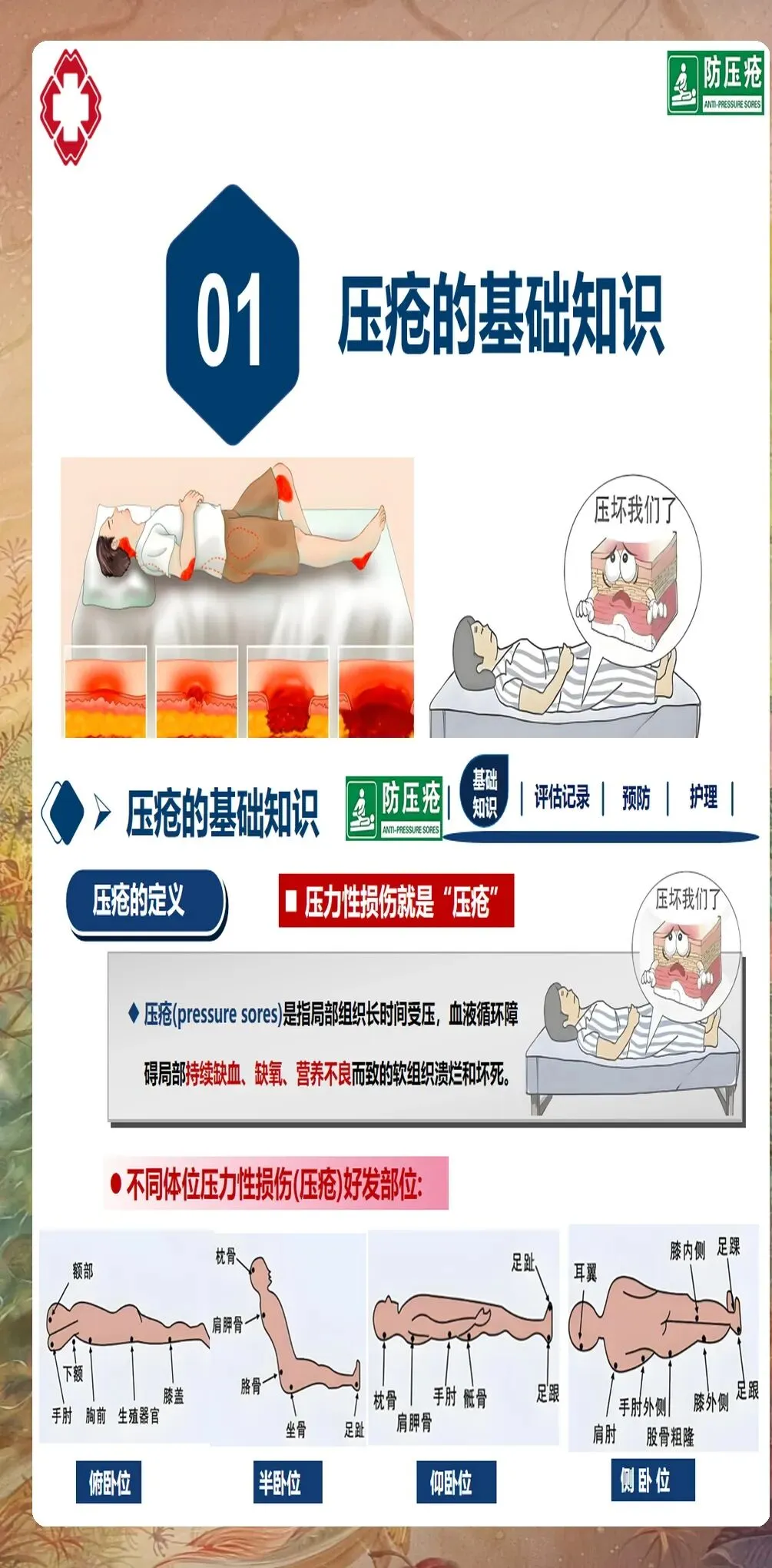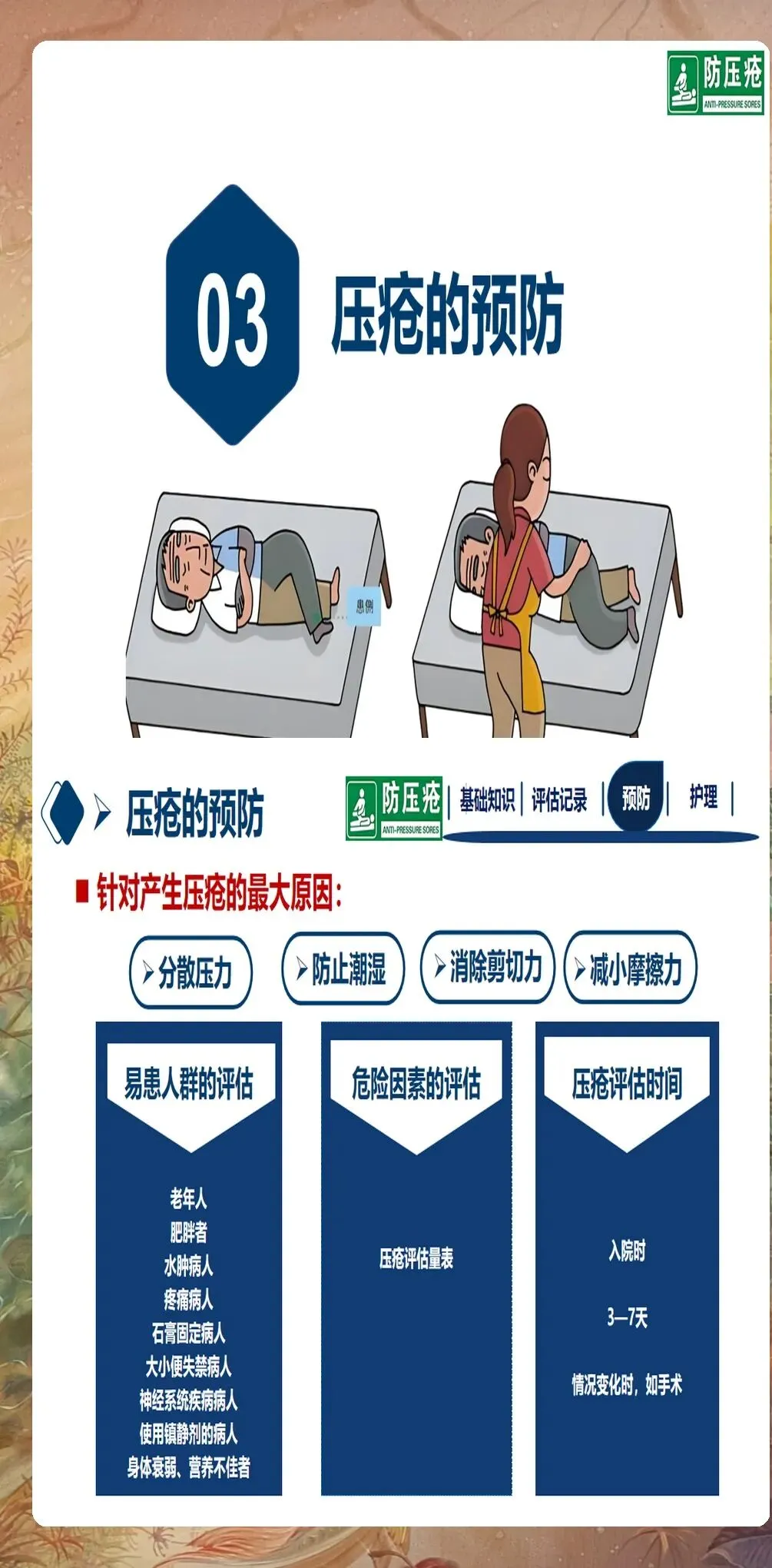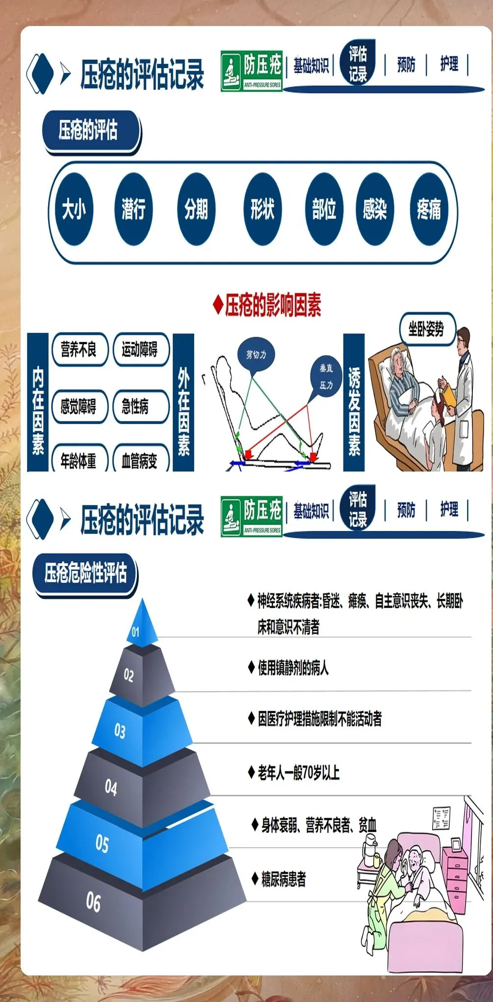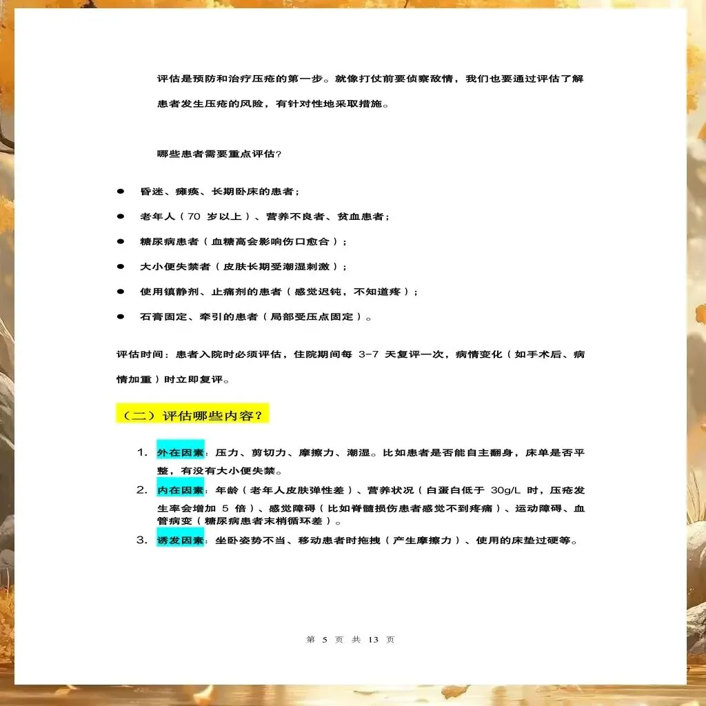 压疮风险评估是预防压疮的第一步,也是至关重要的一步。精准的风险评估能帮助护理人员识别高危人群,制定个性化的预防措施。