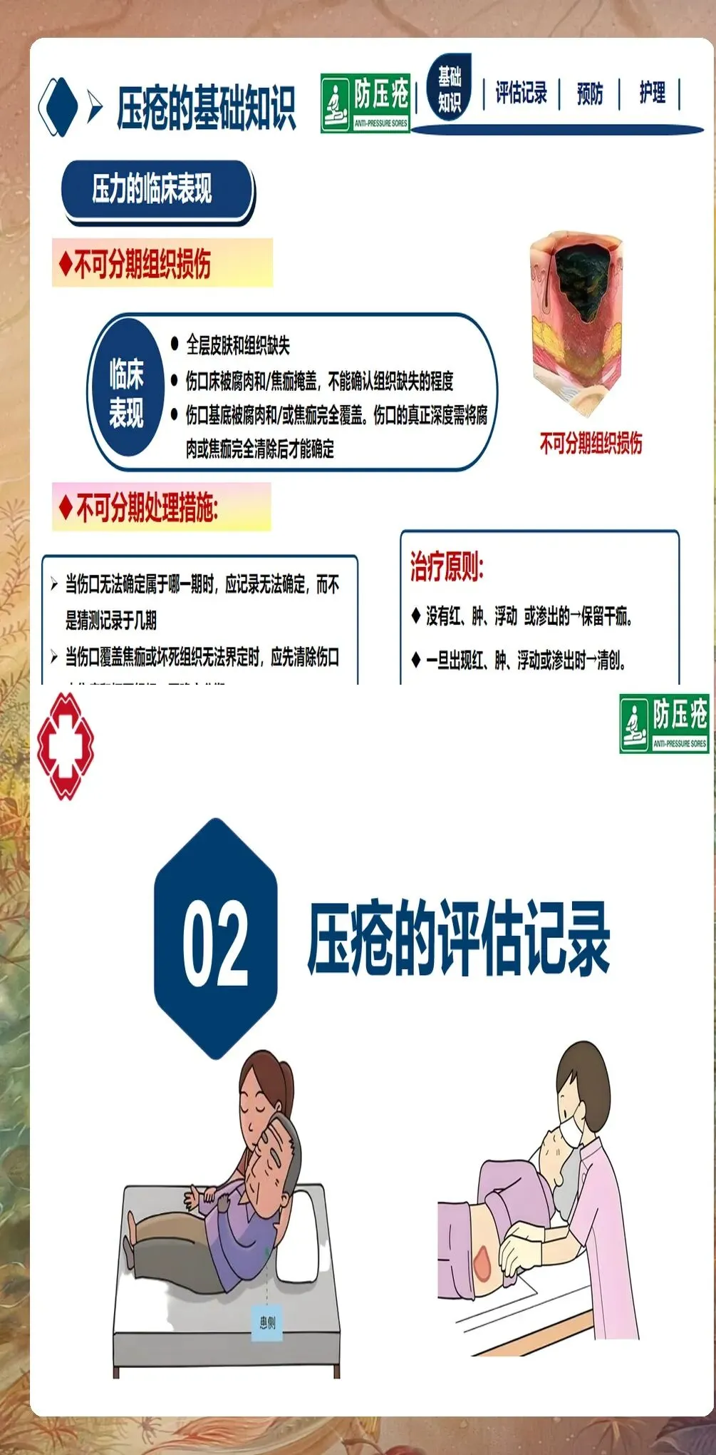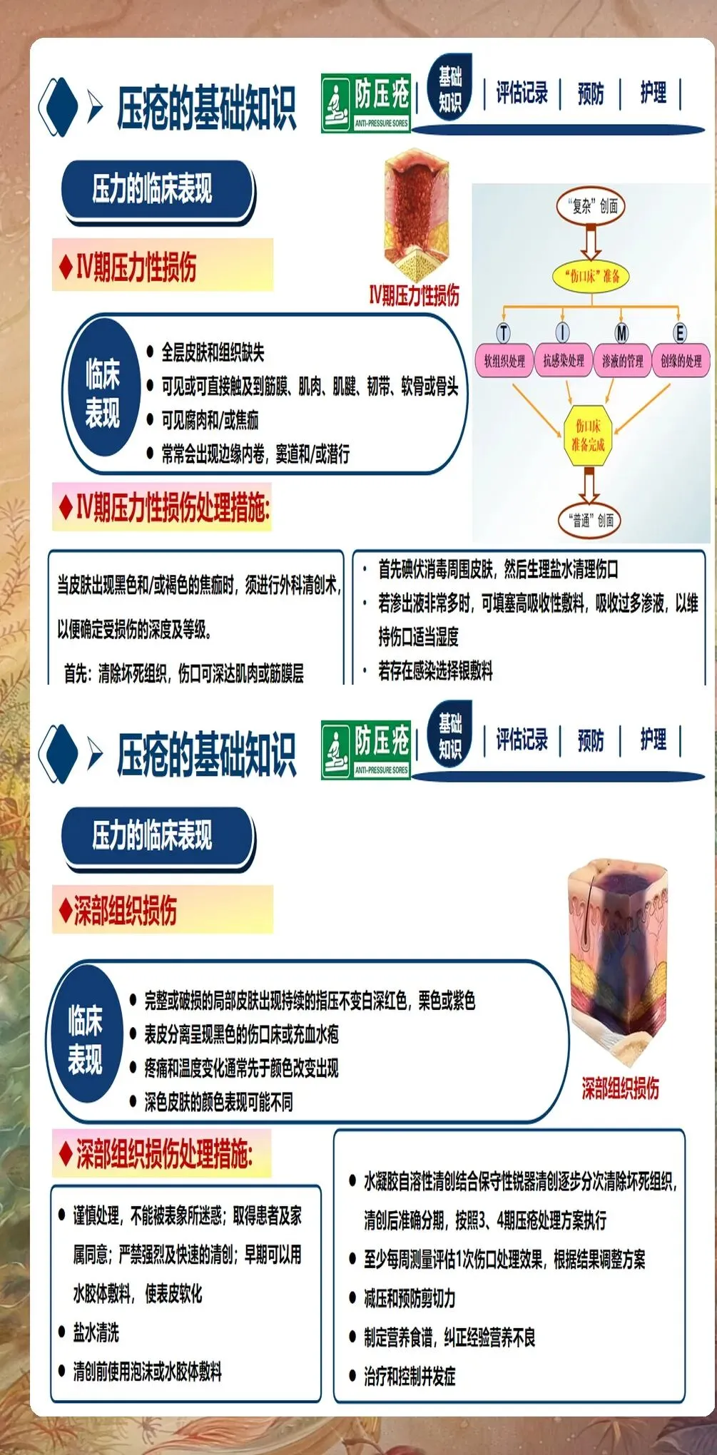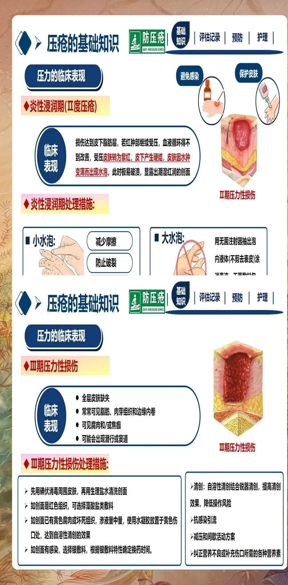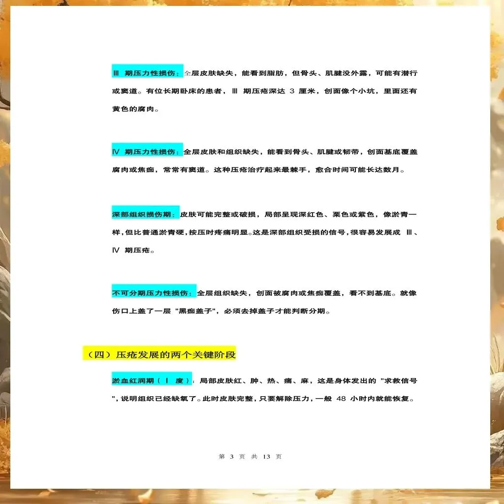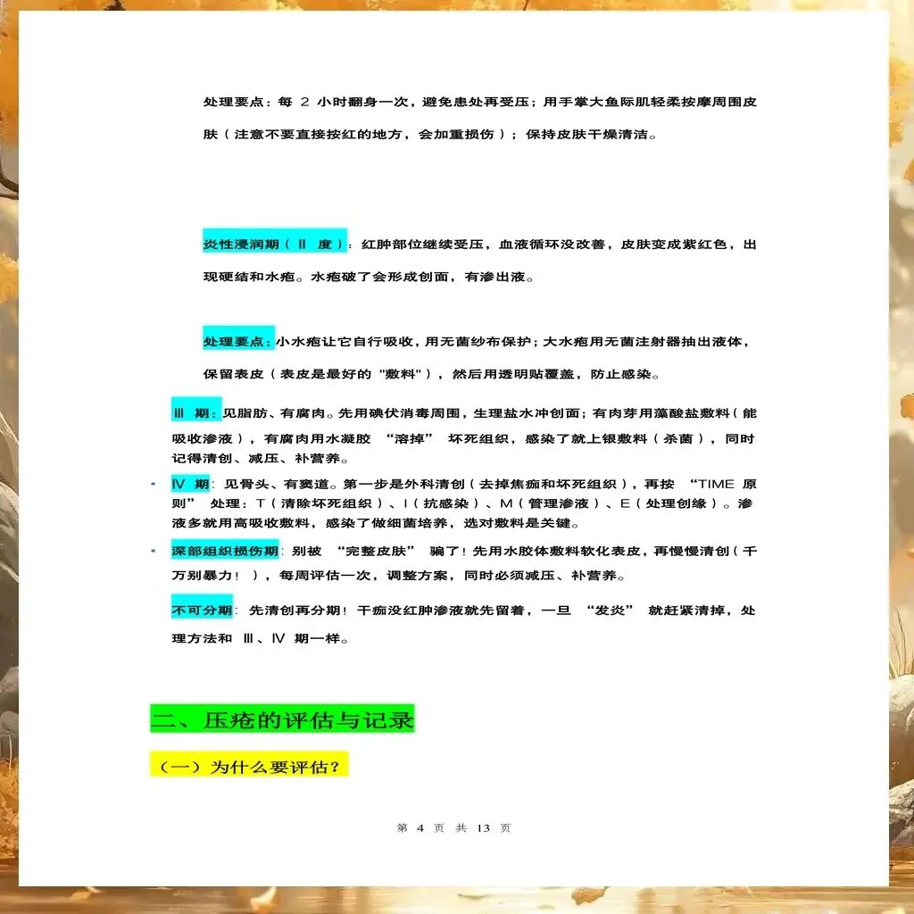 已发生压疮患者的护理:对于已发生压疮的患者,应根据压疮分期制定个性化治疗方案。Ⅰ期压疮:局部减压,使用透明薄膜敷料保护,避免受压,促进血液循环。Ⅱ期压疮:清洁创面,使用水胶体敷料或泡沫敷料,保护创面,促进愈合。Ⅲ期和Ⅳ期压疮:请造口伤口专科护士会诊,彻底清创,选择合适的敷料(如藻酸盐敷料、银离子敷料等),控制感染,促进愈合。不可分期压疮:先清除坏死组织,明确分期后再制定治疗方案。深部组织损伤:密切观察,避免受压,防止进展为更严重的压疮。