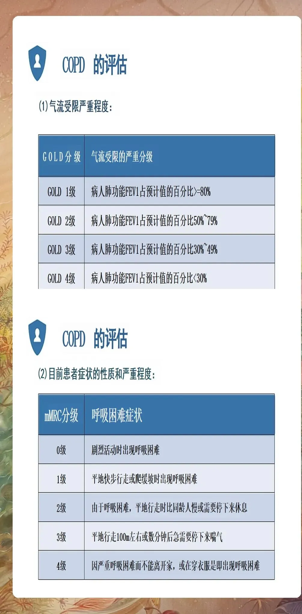 采用改良英国医学研究理事会呼吸困难量表评估呼吸困难程度。患者mMRC评分3级,平地行走100米左右需停下来喘气,提示气流受限严重。采用慢阻肺评估测试(CAT)评估疾病对生活质量的影响,患者CAT评分22分,咳嗽、咳痰、胸闷、活动受限等症状严重影响日常生活。痰液评估包括痰量、颜色、性质、粘稠度,患者每日痰量约50-80ml,黄色脓痰,粘稠不易咳出,提示合并细菌感染,需加强抗感染治疗和气道湿化。