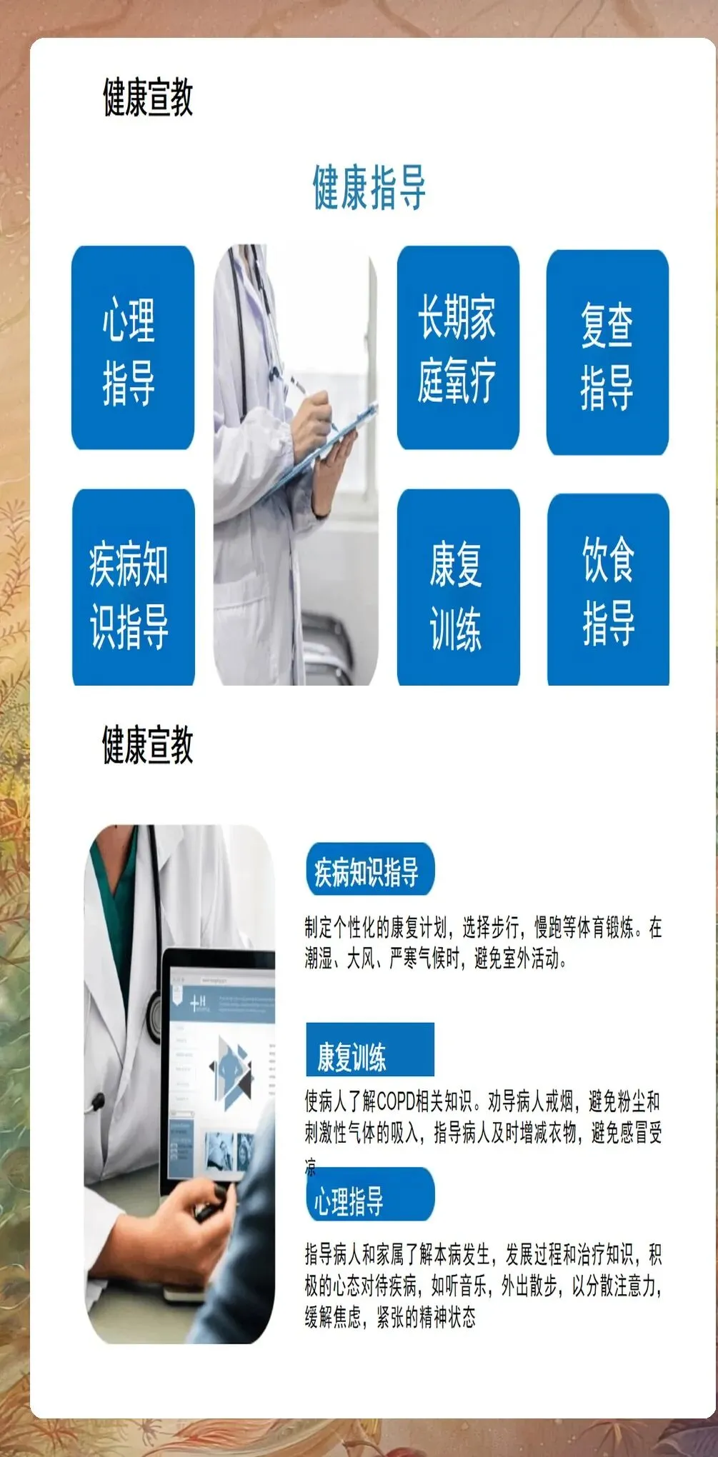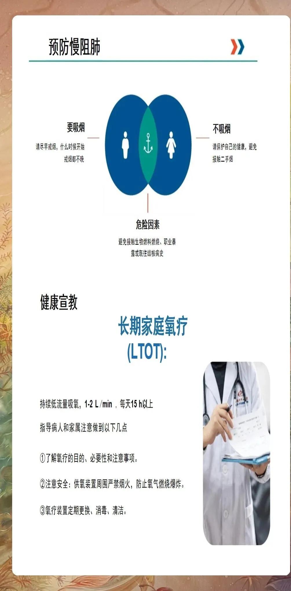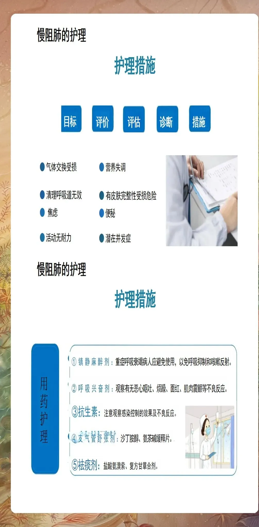 药物治疗配合包括支气管舒张剂、糖皮质激素、抗生素、祛痰药等。支气管舒张剂包括β2受体激动剂(沙丁胺醇、福莫特罗)和抗胆碱能药物(异丙托溴铵、噻托溴铵),可联合使用增强疗效。吸入装置的选择和正确使用至关重要,需反复指导患者掌握吸入技巧,定期检查使用方法。糖皮质激素用于中重度患者急性加重期,可减轻气道炎症,缩短病程,注意口腔护理,预防真菌感染。抗生素根据病原学和药敏结果选择,对于慢阻肺急性加重伴脓痰患者,经验性使用抗生素可改善预后。