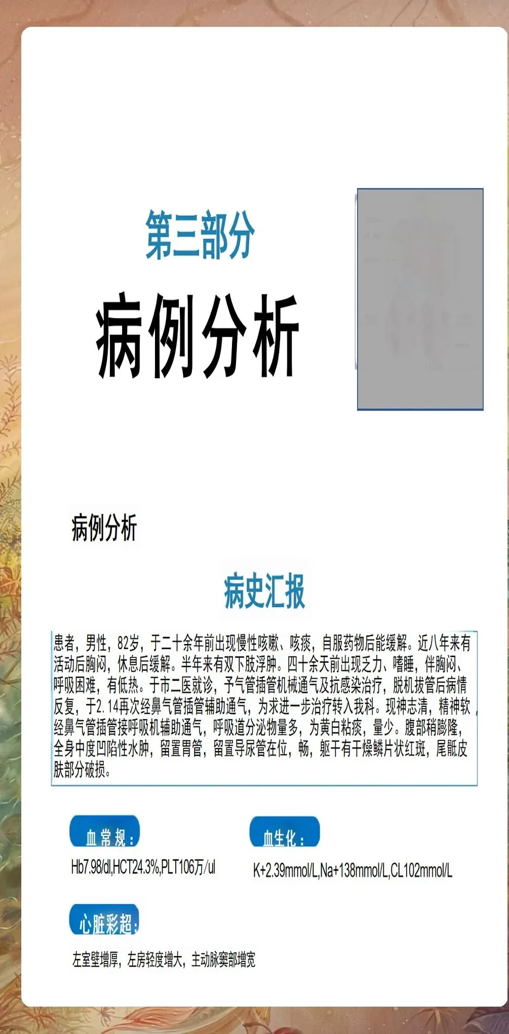 患者男性,72岁,因"反复咳嗽、咳痰30年,活动后气促10年,加重3天"入院。患者30年前无明显诱因开始出现咳嗽、咳白色黏痰,晨起明显,每年冬春季发作,持续3-4个月,近10年逐渐出现活动后气促,上楼梯、快走时明显,休息后可缓解。3天前受凉后咳嗽、咳痰加重,痰量增多,呈黄色脓痰,不易咳出,气促明显,稍活动即感胸闷气喘,遂来院就诊。既往有吸烟史50年,平均20支/日,未戒烟。入院查体:体温37.8℃,呼吸频率26次/分,脉搏102次/分,血压128/76mmHg,血氧饱和度90%(未吸氧状态)。神志清楚,口唇轻度发绀,桶状胸,肋间隙增宽,双肺呼吸音低,可闻及散在干湿性啰音,心界向左下扩大,心率102次/分,律齐,双下肢无水肿。肺功能检查:FEV1/FVC 52%,FEV1占预计值48%,GOLD分级Ⅲ级。血气分析(未吸氧):pH 7.36,PaCO2 52mmHg,PaO2 58mmHg,HCO3- 32mmol/L。诊断:慢性阻塞性肺疾病急性加重期,慢性肺源性心脏病(代偿期)。