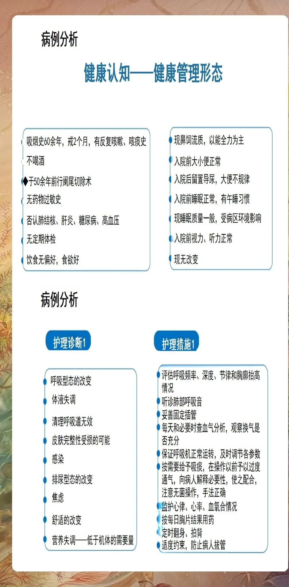 诊断依据:PaO2 58mmHg,PaCO2 52mmHg,SpO2 90%,口唇发绀,活动后气促加重。护理目标:维持PaO2≥60mmHg,PaCO2维持在45-55mmHg,SpO2≥90%。干预措施包括氧疗管理、呼吸训练、体位管理、药物治疗。