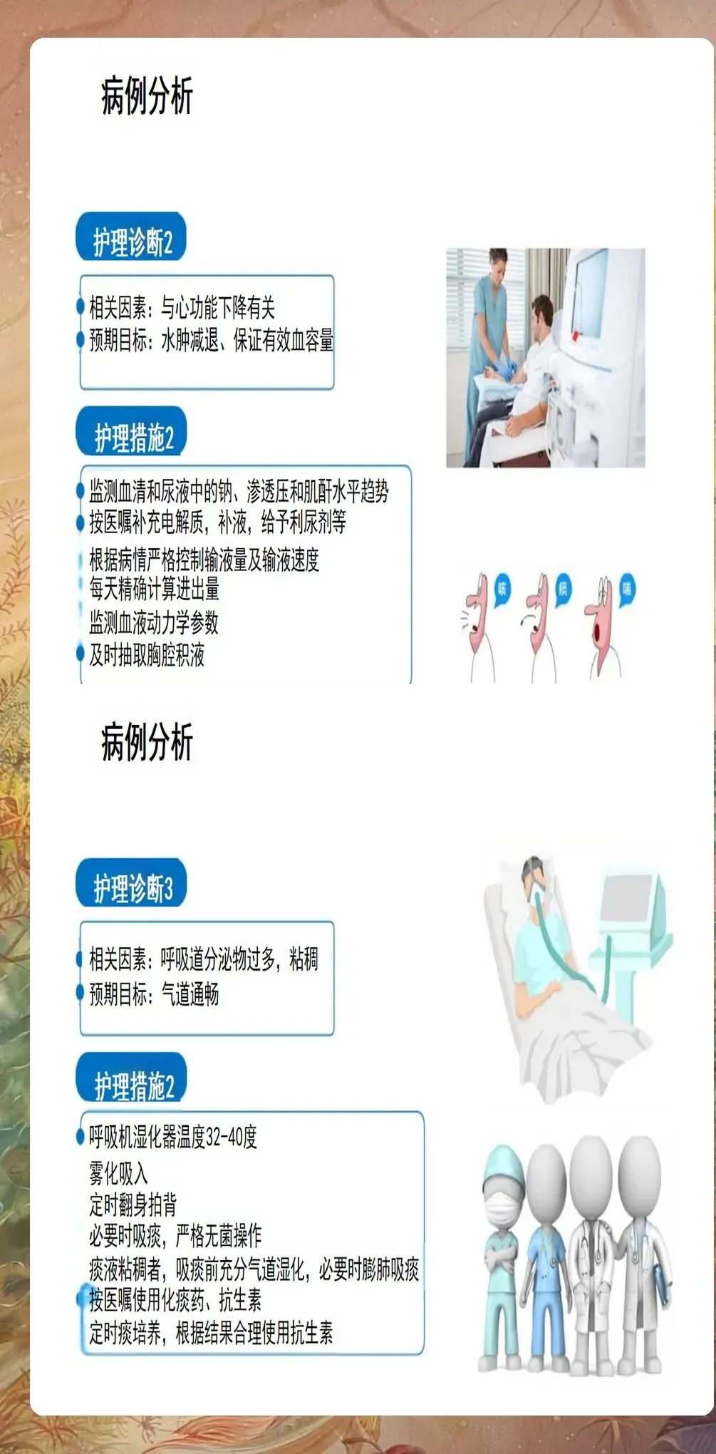 体位管理采用半卧位或坐位,床头抬高30-45度,减轻膈肌负担,增加肺活量。避免过度前屈或压迫腹部的体位,以免限制膈肌运动。夜间睡眠时可采用高枕或抬高床头,改善氧合,减轻呼吸困难。