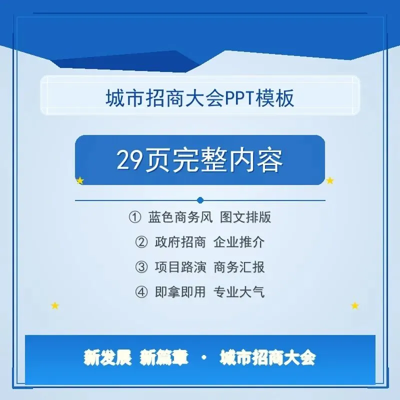 这是一套蓝色商务风格的PPT模板,共29页完整内容,适合招商大会、项目推介、企业路演等场景使用。模板采用图文排版设计,配色大气稳重,可直接套用修改文字内容。