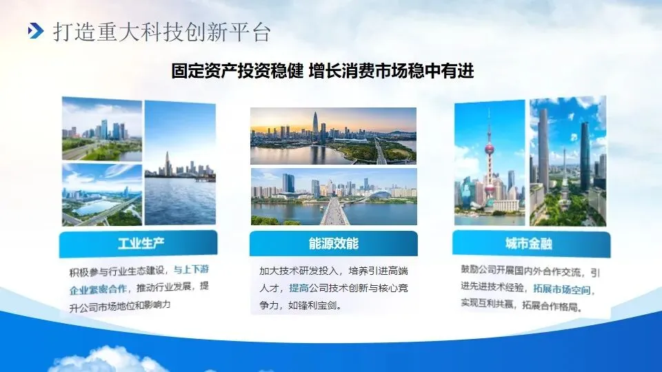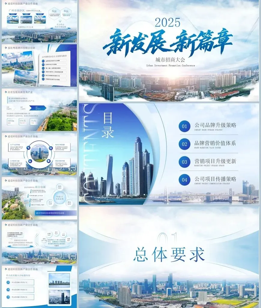 模板设计精美,封面、目录、内容页、数据图表页、结尾页等结构。适用政府招商、企业推介、项目路演、商务汇报等正式场合。