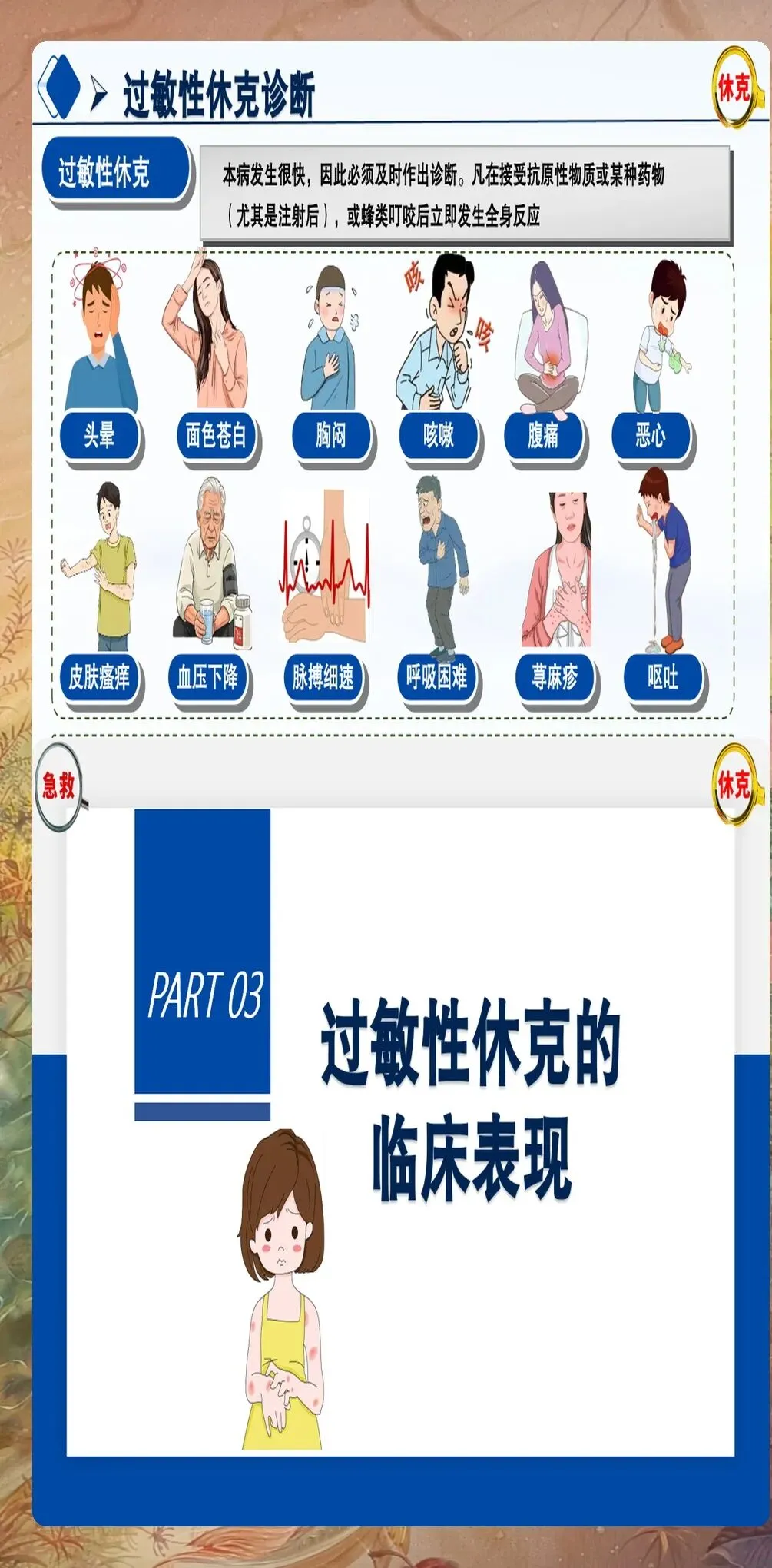 临床表现识别:过敏性休克的典型表现为突然出现的皮肤症状(如荨麻疹、血管性水肿、皮肤瘙痒等)、呼吸道症状(如喉头水肿、支气管痉挛、呼吸困难等)、心血管症状(如低血压、心动过速、心律失常等)、胃肠道症状(如恶心、呕吐、腹痛等)。需要注意的是,部分患者可能仅表现为非典型症状,如意识改变、尿失禁等。
