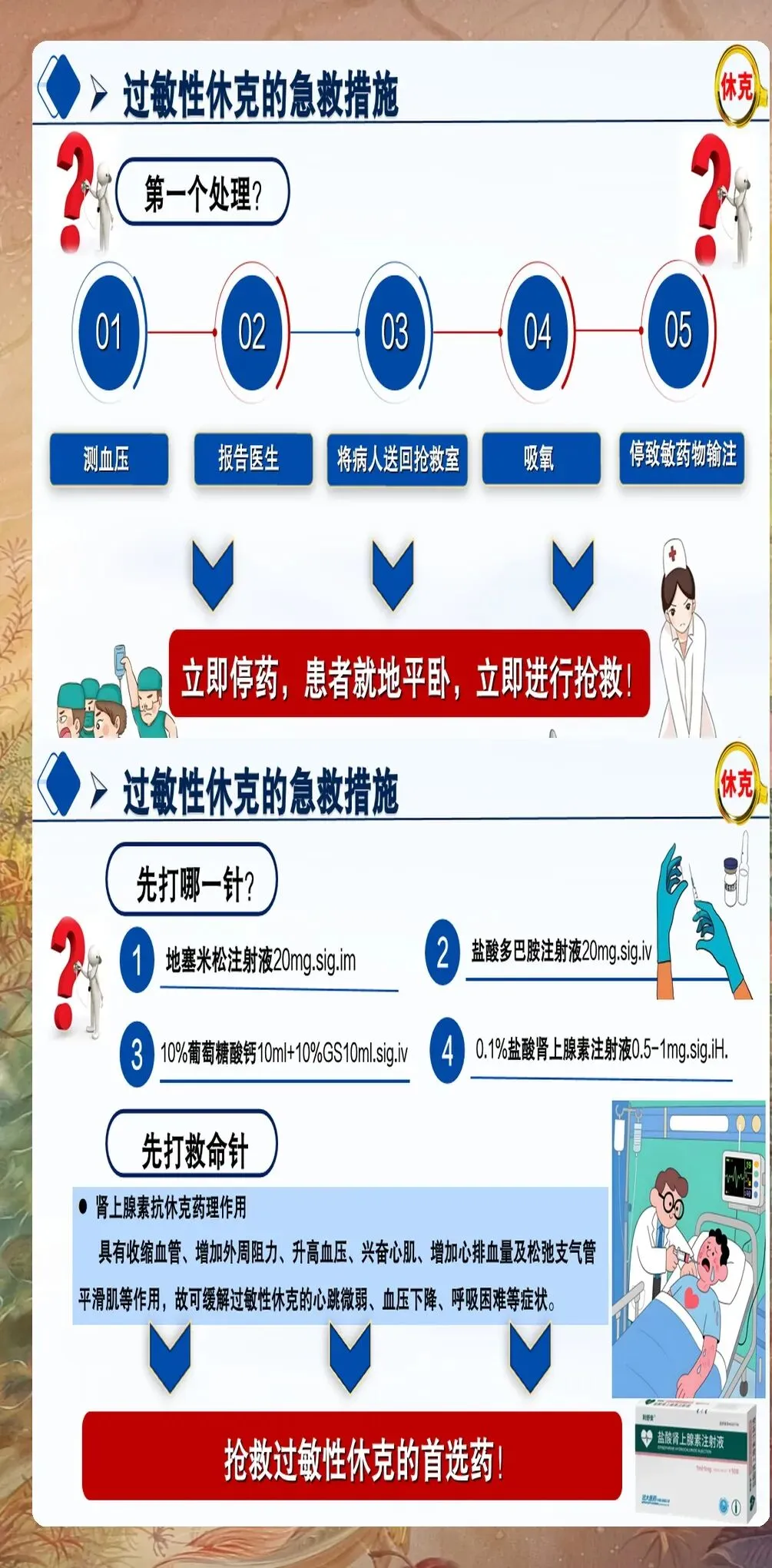 第五步:药物辅助治疗:在肾上腺素治疗的基础上,可给予辅助药物治疗。对于持续性低血压,可使用去甲肾上腺素维持血压;对于支气管痉挛,可使用沙丁胺醇等支气管扩张剂雾化吸入;对于严重荨麻疹、血管性水肿,可给予抗组胺药物(如苯海拉明)和糖皮质激素(如氢化可的松、地塞米松)。需要注意,糖皮质激素起效较慢,不能替代肾上腺素的作用。