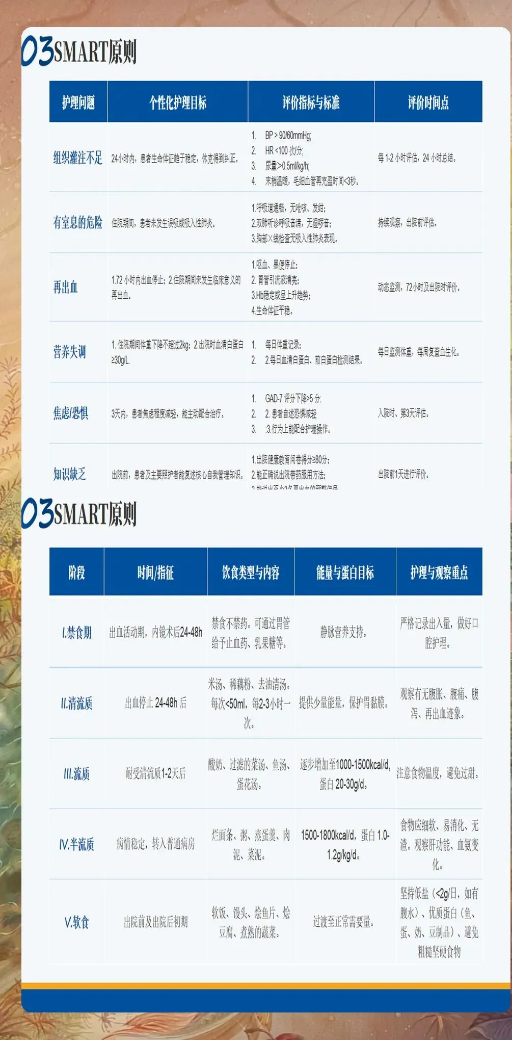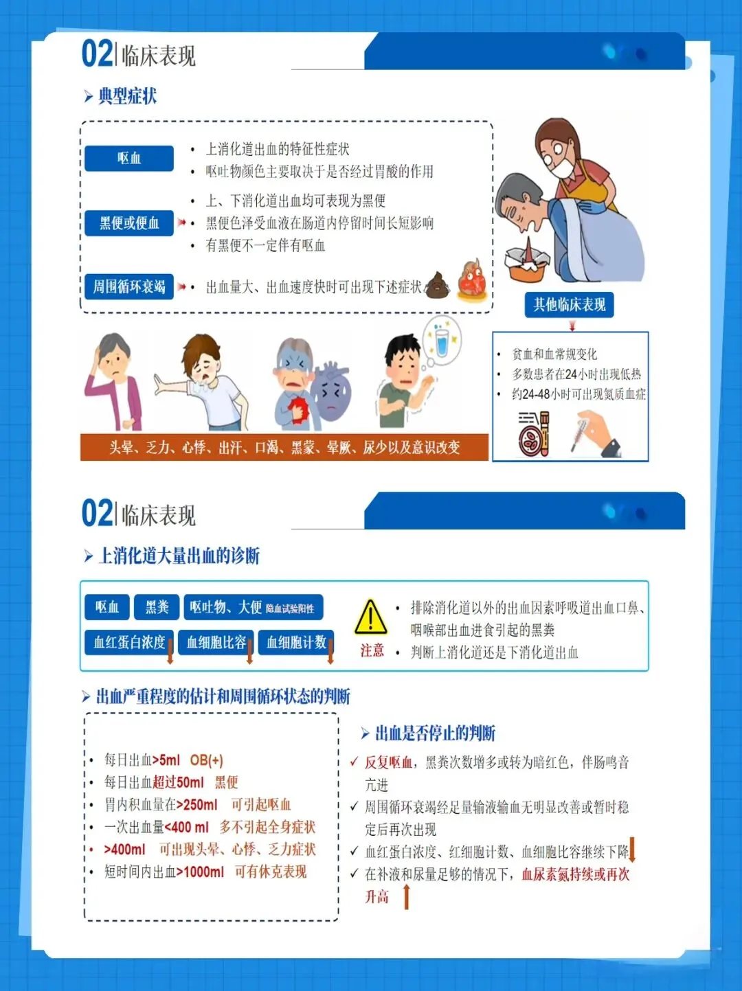 二、病情观察:透过表象看本质 传统的"呕血量+黑便量"估算往往误差较大。更可靠的是通过生命体征变化和尿量来评估失血程度——当收缩压下降超过20mmHg、心率增快超过20次/分、尿量少于0.5ml/kg/h时,即使出血量看似不大,也提示可能存在活动性出血。 胃管引流液的观察需要"动态视角"。引流液颜色从鲜红转为咖啡色,再转为清亮,是出血停止的重要标志。但需要注意,胃内积血超过250ml时可能暂时无引流液,不能误判为出血停止。此时应配合评估肠鸣音,若肠鸣音减弱或消失,提示休克加重。 再出血风险评估要关注"危险信号":24小时内反复呕血、黑便次数增多且转为暗红色血便、外周血红细胞计数持续下降、尿素氮升高后再次下降,这些都是再出血的高危征兆,需立即报告医生并做好抢救准备。