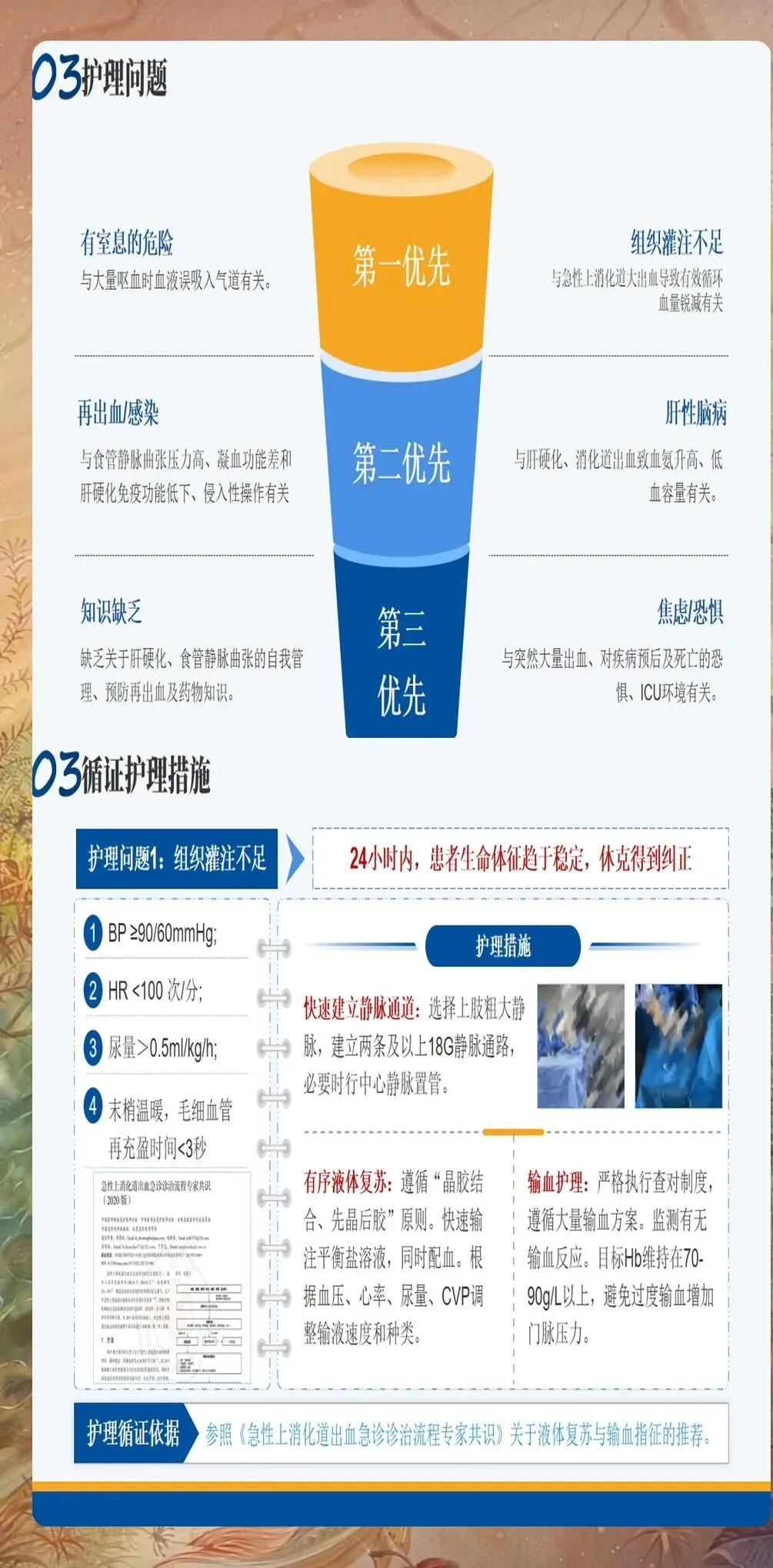 一、急救护理:黄金3小时的精细化处置 急性大出血期,时间就是生命。建立两条以上大孔径静脉通道是基础操作,但通道位置的选择很有讲究——优先选择颈内静脉或锁骨下静脉,避免下肢静脉,因为出血时下腔静脉回流受阻,药物难以快速到达心脏。 液体复苏策略要精准把握"平衡点":初始阶段快速输注平衡盐溶液1000-2000ml,但收缩压回升至90mmHg后需立即减慢输液速度,避免血压骤升诱发再次出血。同时密切监测中心静脉压,维持在8-12cmH2O较为理想。 止血药物的使用时机同样关键:生长抑素首剂250μg静脉推注后,立即以250μg/h持续泵入,推注时间不少于1分钟,避免一过性血压下降。质子泵抑制剂选择埃索美拉唑80mg静脉推注后,以8mg/h持续维持,能快速提升胃内pH值至6以上,促进血小板聚集。