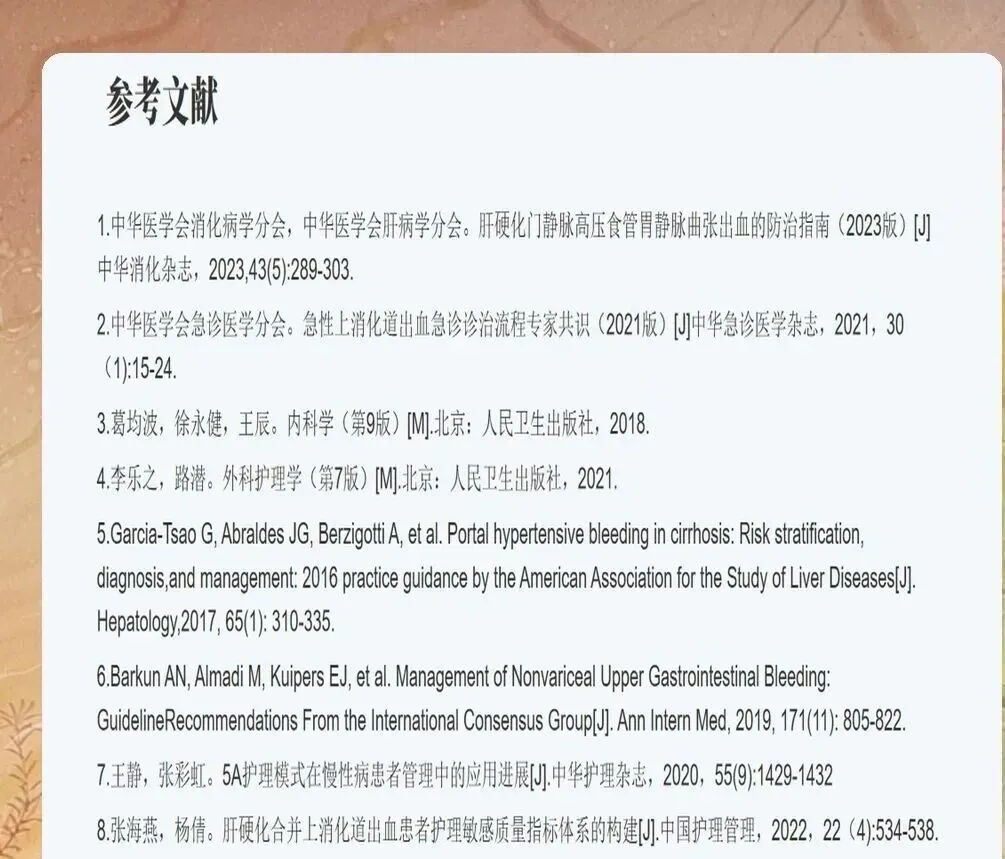 三、并发症预防:细节决定预后 肝性脑病是肝硬化合并上消化道出血患者最严重的并发症。护理中要严格控制蛋白质摄入量,急性期禁食蛋白质,病情稳定后从每天0.5g/kg逐步增加。同时保持大便通畅,每日乳果糖30-60ml分次口服或鼻饲,维持软便2-3次/日,减少氨的吸收。 误吸性肺炎的预防重在体位管理。呕血时立即将患者头偏向一侧,及时清除口鼻腔分泌物。病情稳定后,抬高床头30-45度,鼻饲前检查胃内残留量,超过150ml时暂停鼻饲。对于意识障碍患者,尽早留置空肠营养管,实施空肠内营养。 三腔二囊管的使用是有创操作,必须严格掌握适应症。置管前向患者及家属充分告知,取得知情同意。压迫止血期间,每12-15分钟放松牵引一次,持续5分钟,避免胃黏膜缺血坏死。气囊压迫时间一般不超过24小时,出血停止后观察24小时无再出血,方可拔管
