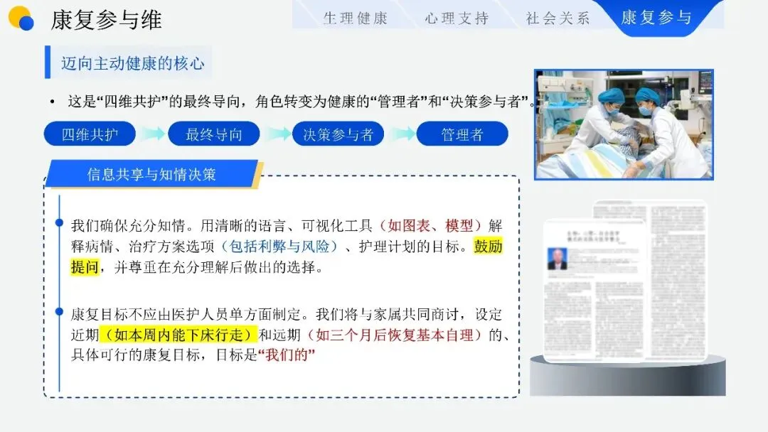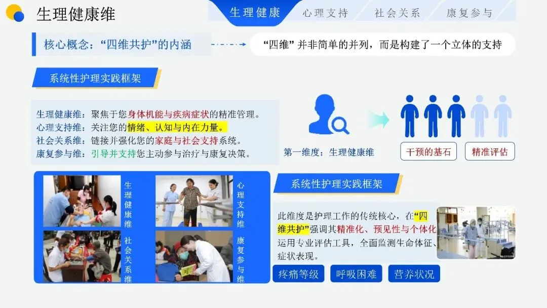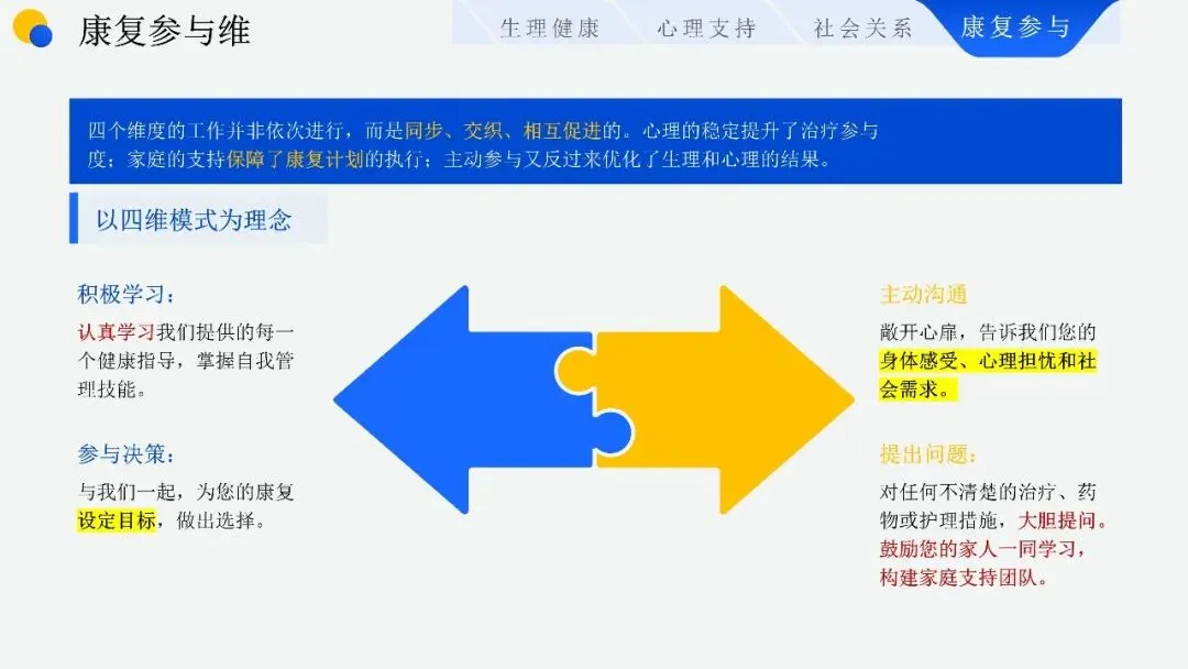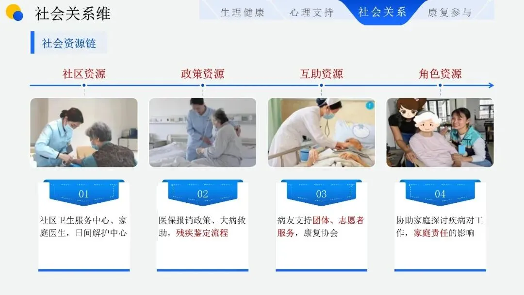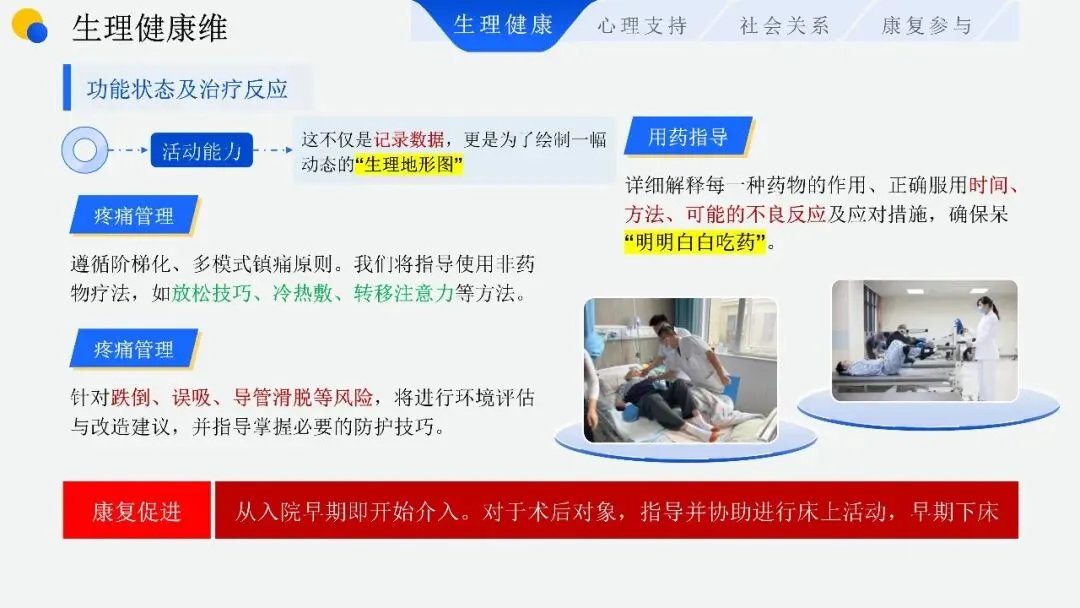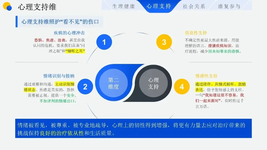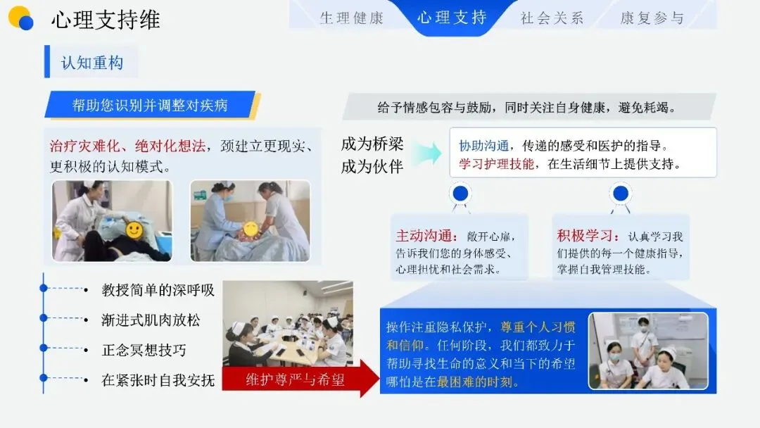 生理健康维聚焦症状管理、疼痛控制、用药指导与风险防范;心理支持维关注情绪疏导、认知重构与心灵关怀,守护看不见的伤口;社会关系维搭建家庭支持网,链接社区与政策资源,减轻照护负担;康复参与维鼓励患者主动加入治疗决策,实现从 “被动接受” 到 “主动管理” 的转变。