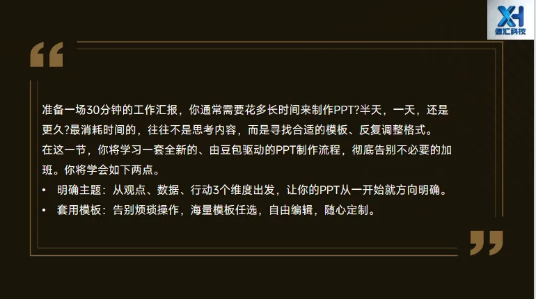 上一期我们讲了信息太多记不住?AI 帮你真正内化知识,帮大家解决了学习吸收效率低的问题。这一期,我们聚焦职场人最头疼的PPT 制作,用豆包 AI 实现快速出稿、格式省心、汇报不加班,全程零门槛上手!