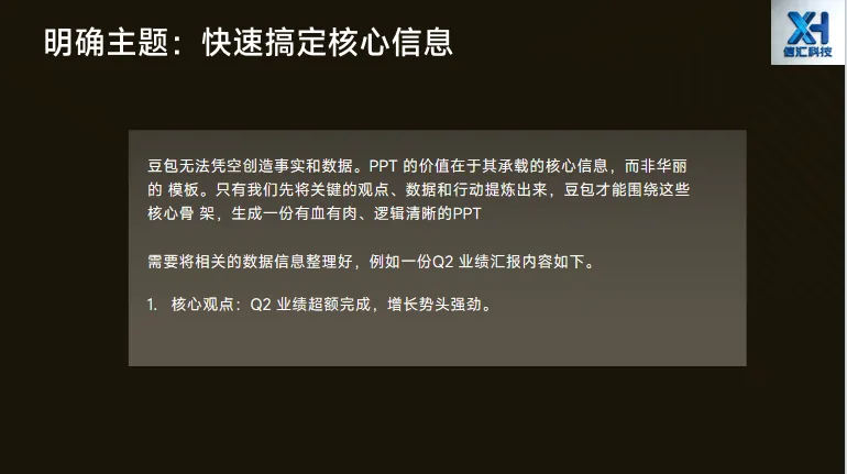 豆包不创造事实,但能把你的内容变清晰。先整理观点 + 数据 + 行动三大核心:核心观点:一句话定调(例:Q2 业绩超额完成,增长强劲)