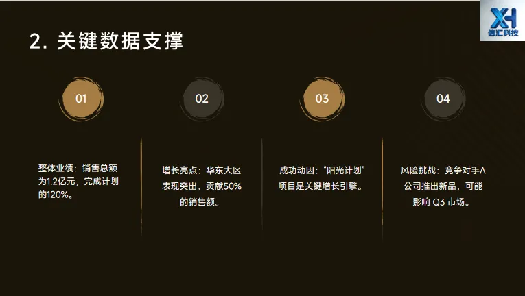 关键数据:用数字支撑结果(例:销售额 1.2 亿,完成计划 120%)