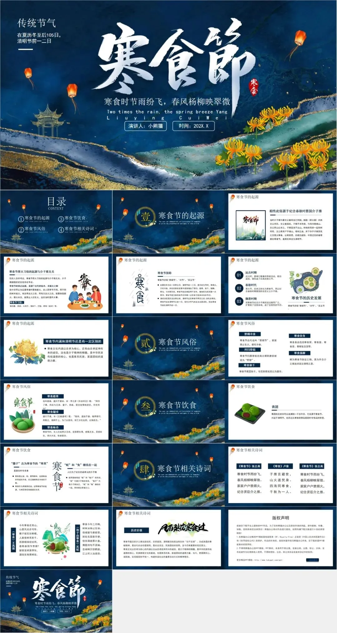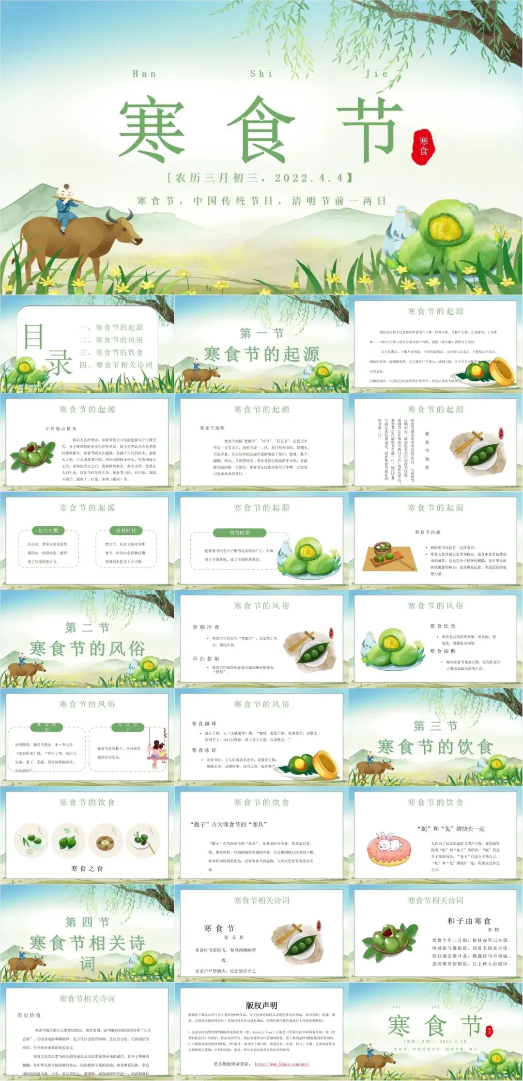 每页设计融入古风元素,脉络清晰好排版,无论是课堂分享、文化科普还是节日活动都适用。让千年寒食的忠孝内涵与春日雅趣,随一页页幻灯片缓缓流淌解锁传统节日的诗意表达!