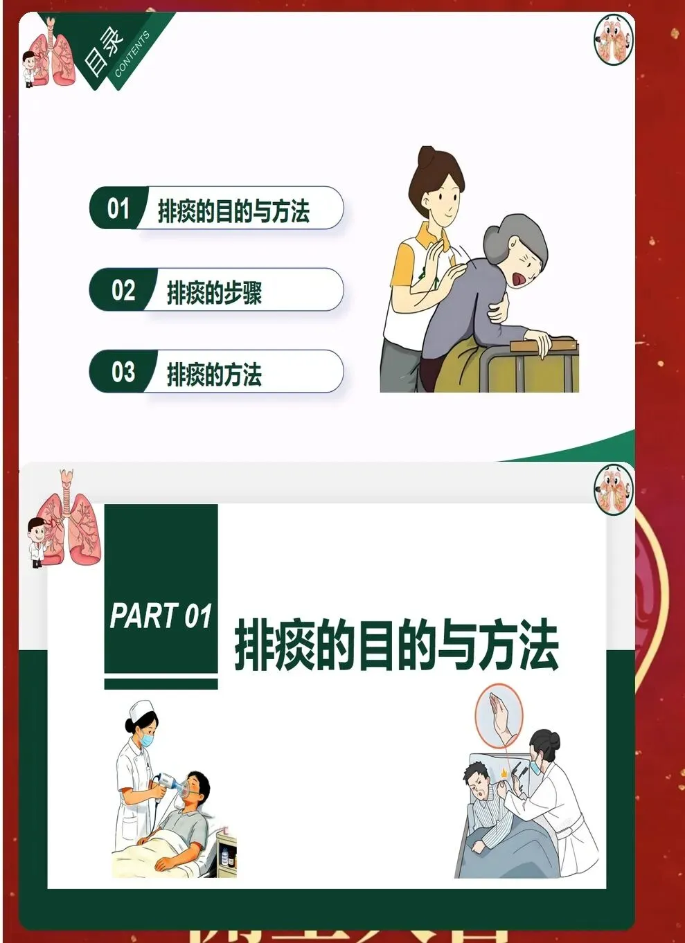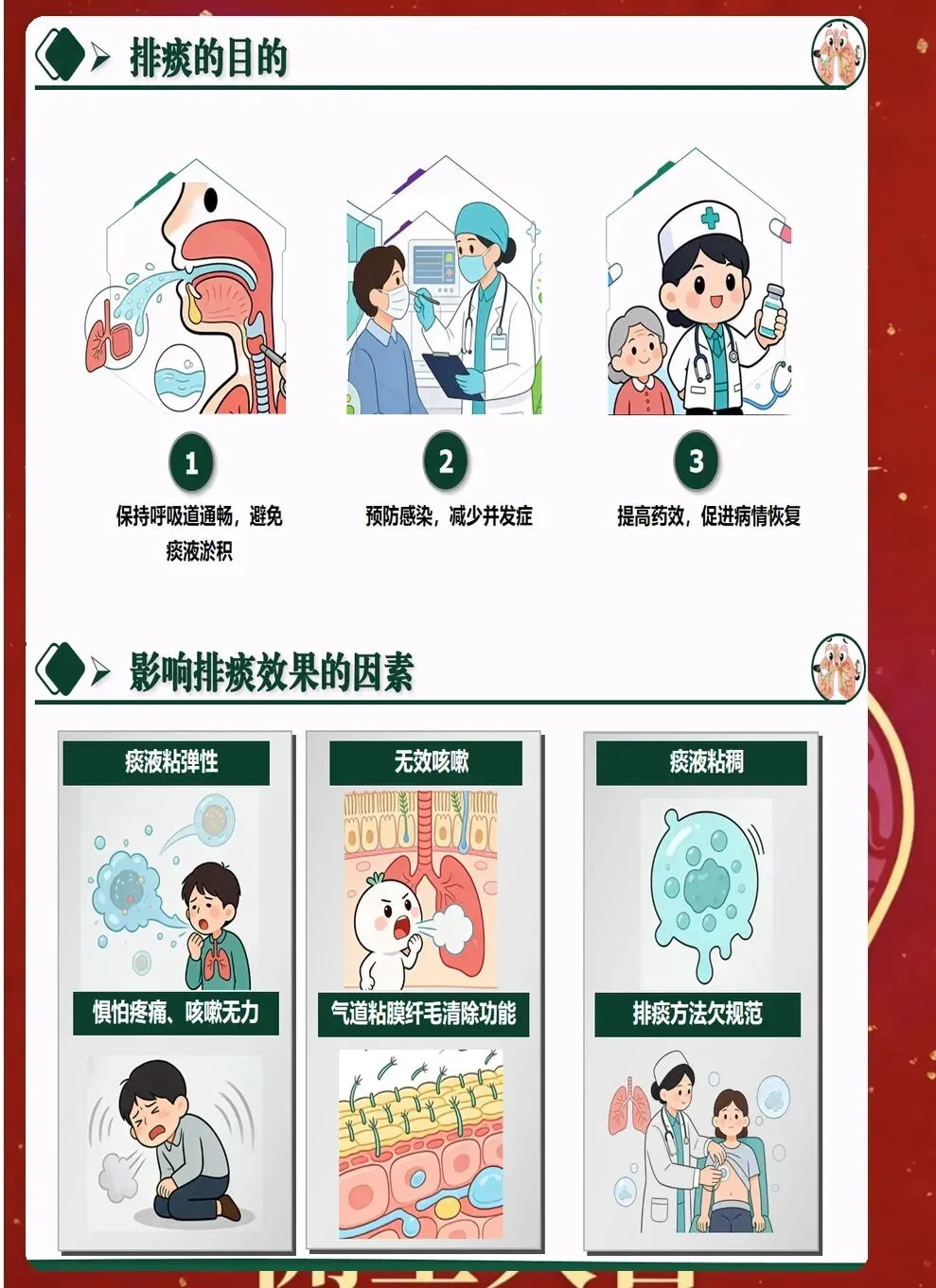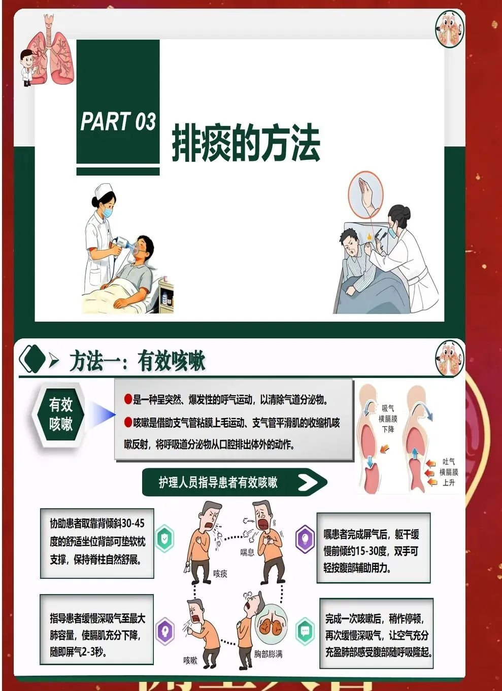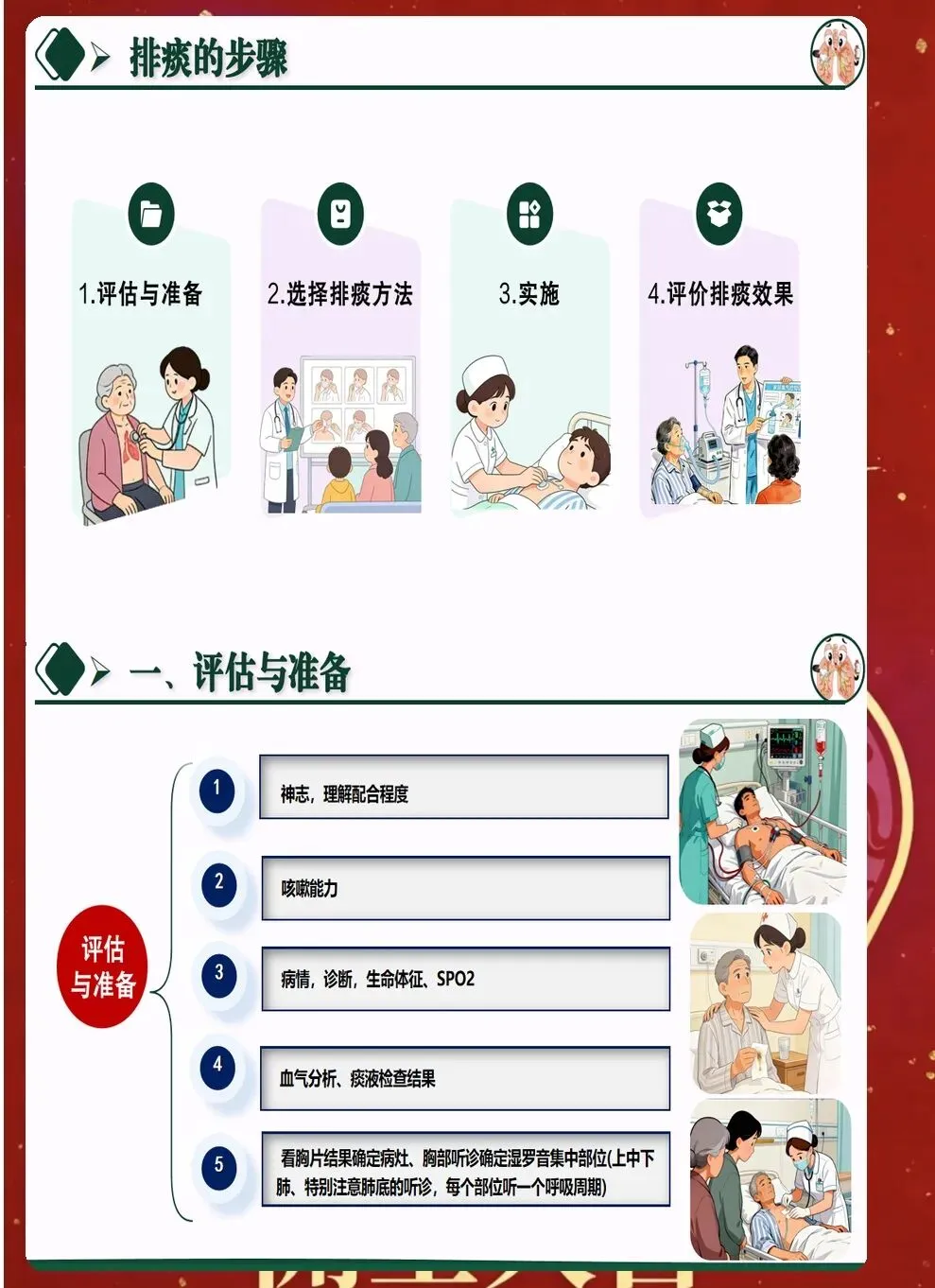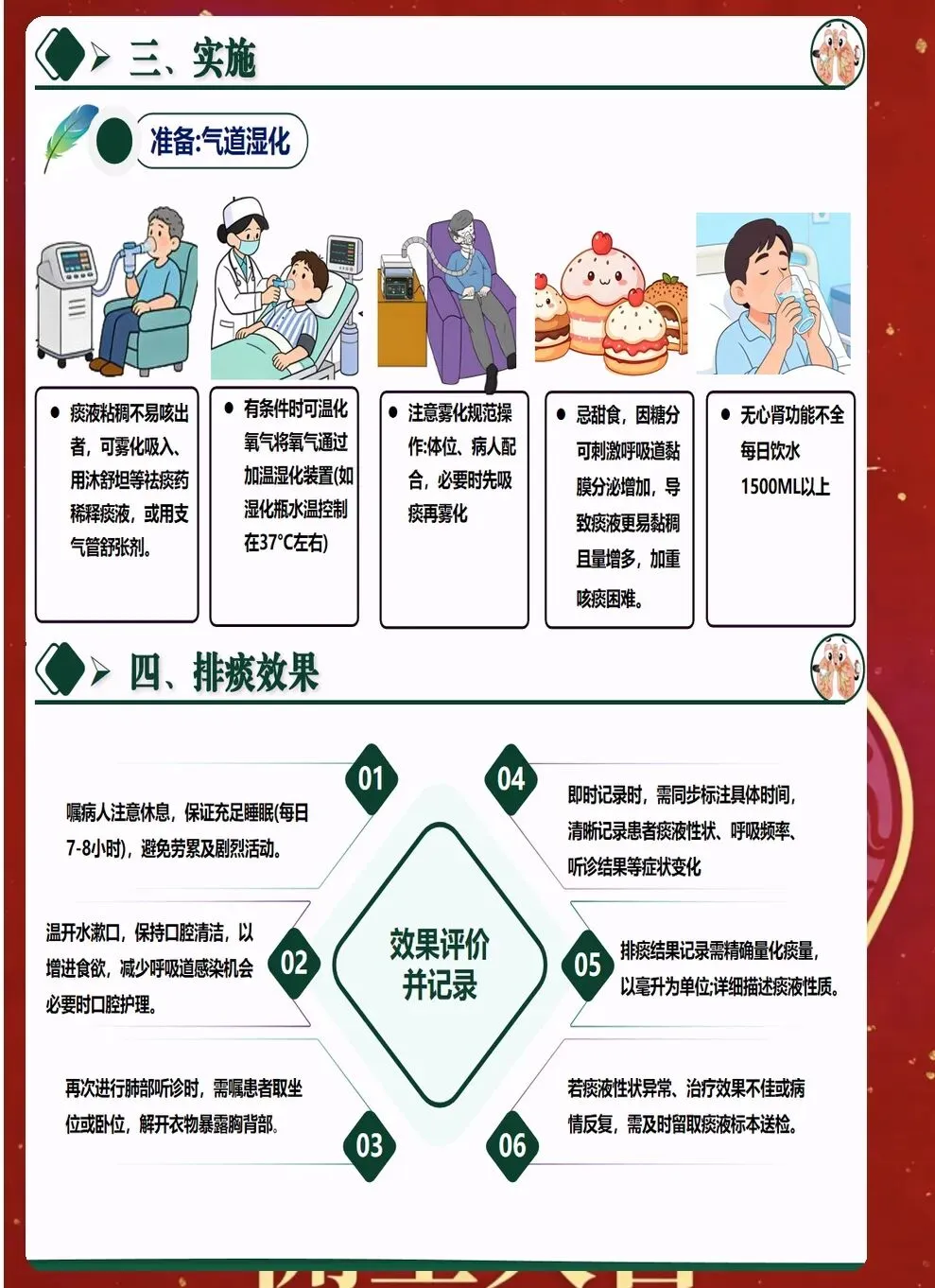 八、效果评价与持续改进 排痰效果需要客观评价。通过听诊呼吸音变化、观察痰液排出量、监测血氧饱和度等指标,综合评估排痰效果。记录排痰前后对比,为后续治疗提供依据。 建立排痰护理记录单,详细记录评估结果、实施措施、效果评价等。定期回顾分析,总结经验教训,持续改进排痰护理质量。