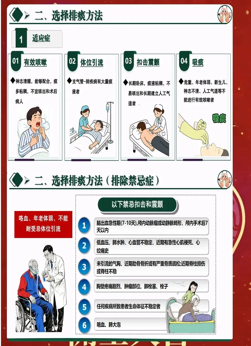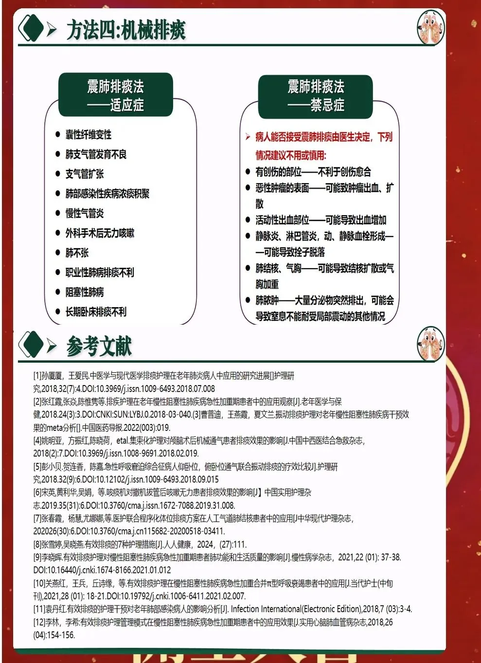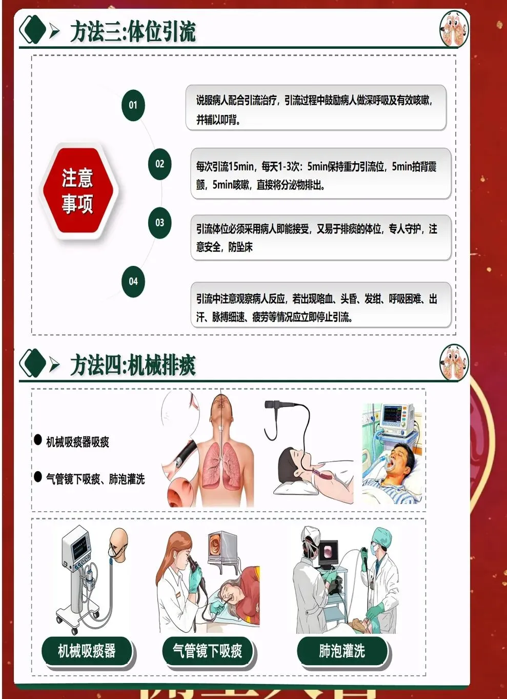 七、并发症的预防与处理 排痰过程中可能出现多种并发症。气道黏膜损伤较为常见,表现为痰中带血。要调整操作力度,必要时暂停排痰,给予对症处理。 支气管痉挛多发生在有哮喘史的患者。表现为呼吸困难、喘息音。应立即停止操作,给予支气管扩张剂雾化,必要时使用激素。 心律失常是严重并发症,多见于老年患者和重症患者。操作过程中要密切监测心率和心律,如有异常及时处理。
