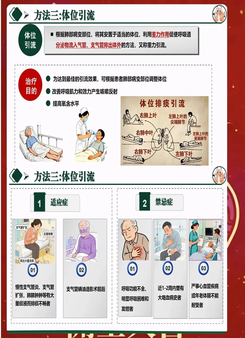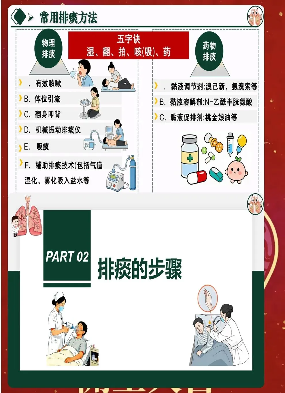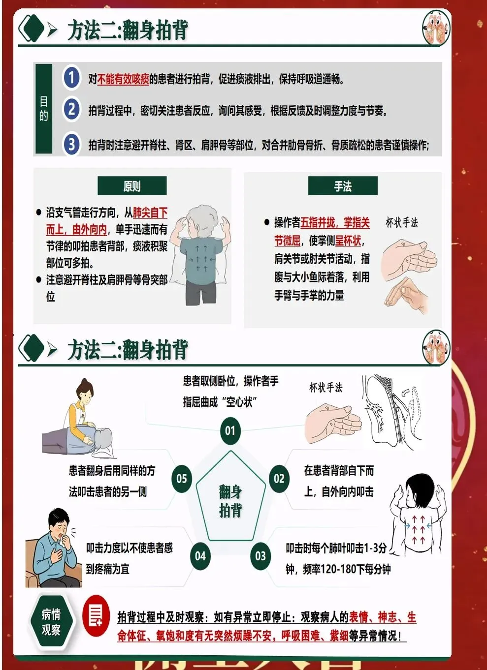 七、并发症的预防与处理 排痰过程中可能出现多种并发症。气道黏膜损伤较为常见,表现为痰中带血。要调整操作力度,必要时暂停排痰,给予对症处理。 支气管痉挛多发生在有哮喘史的患者。表现为呼吸困难、喘息音。应立即停止操作,给予支气管扩张剂雾化,必要时使用激素。 心律失常是严重并发症,多见于老年患者和重症患者。操作过程中要密切监测心率和心律,如有异常及时处理。